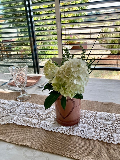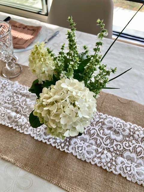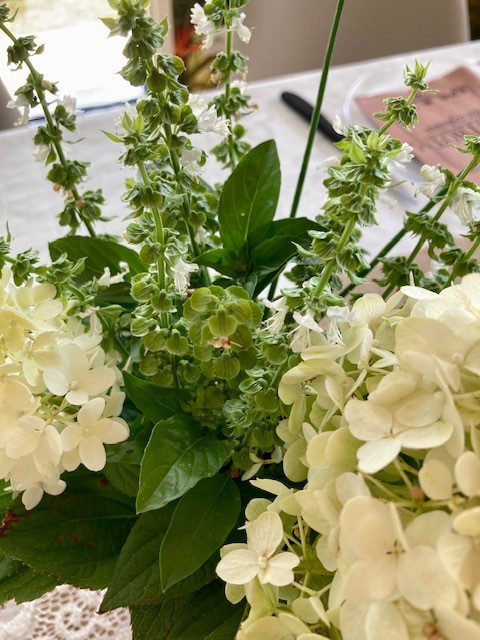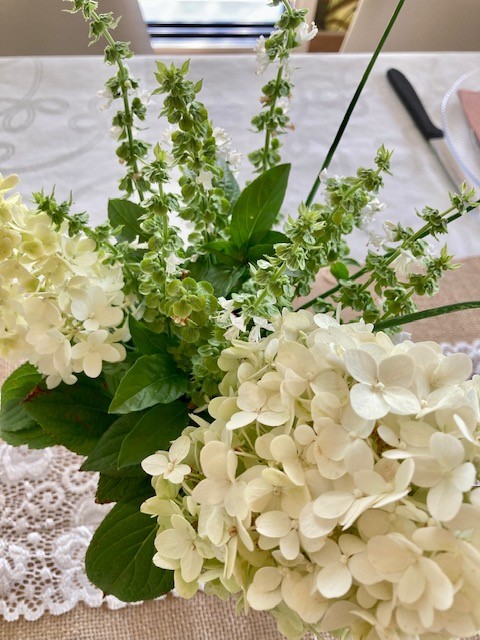 Pas toujours évident de trouver de jolies fleurs pour un centre de table. En temps normale je le trouve dans mon jardin, cependant avec la sècheresse de ces mois de juillet et aout pas évident de trouver encore de belles fleurs. Si vous manquez vous aussi de fleurs fraiches pour votre centre de table vous pouvez le réaliser avec des fleurs et herbes aromatiques. J’ai par exemple agrémenté ma fleur d’hydrangea par des tiges de basilic en fleur et quelques brins de ciboulette que j’ai en quantité dans mon jardin. Voici un centre de table à la fois joli et parfumé qui viendra mettre votre table en valeur. De plus le basilic à des propriétés anti mouches, en effet sa feuille dégage un parfum qui leur est désagréable, vous pourrez ainsi déjeuner dehors en toute tranquillité.
