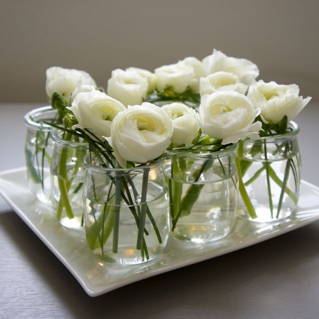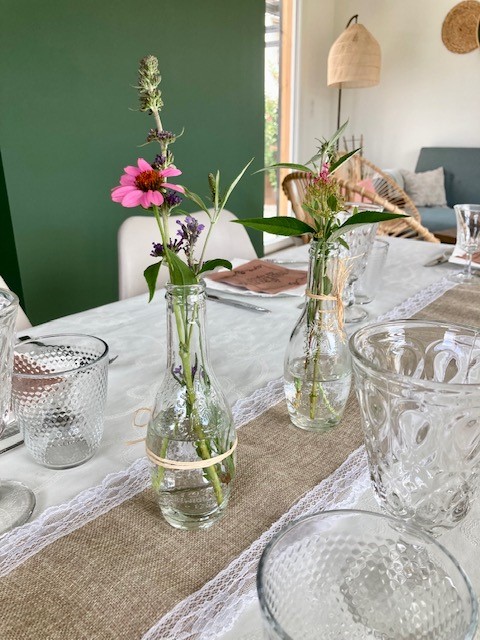 Si vous ne disposez pas de flacons ou de petites bouteilles en verre pour votre centre de table, vous pouvez également utiliser des pots de yaourt que vous trouverez dans le commerce type « la laitière ».