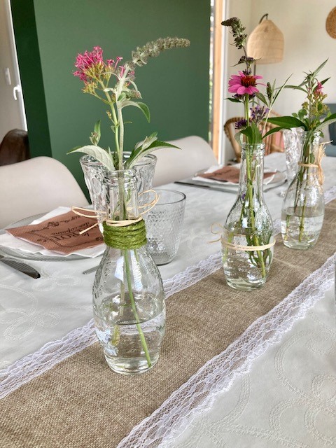 Pas besoin d’éléments décoratifs compliqués pour donner rapidement et sans frais un esprit campagne à votre table. Un joli centre de table pour être très facilement réalisé avec des flacons et bouteilles dépareillés et quelques fleurs des champs ou que vous trouverez près de chez vous. Puisqu’il ne faut qu’une ou deux fleurs par bouteille pour un effet léger, vous pouvez également y mettre des fleurs cueillies dans votre jardin ou coupées depuis des buissons décoratifs, le mieux sera de prendre des fleurs de petite taille. Pour personnaliser votre centre de table, vous pouvez également décorer vos flacons ou bouteilles avec de la dentelle, des rubans ou du raphia.