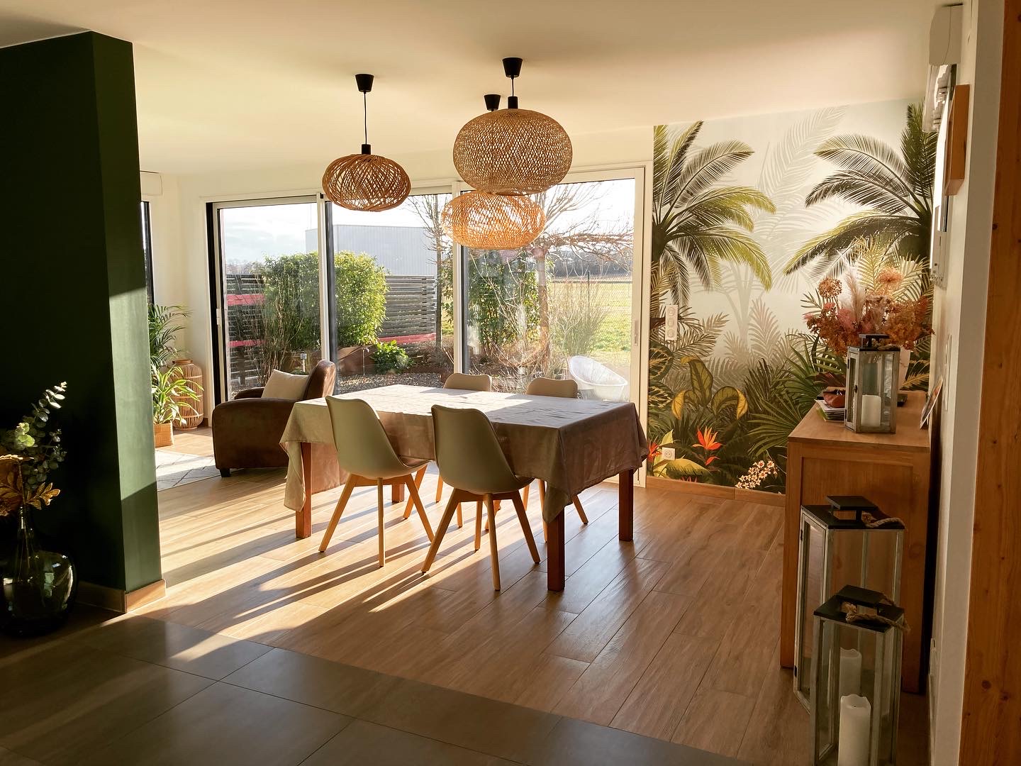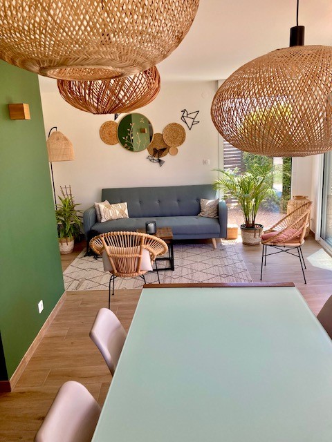 Pour ce projet, le couple souhaitait une pièce à vivre lumineuse et confortable pour pouvoir y accueillir famille et amis aussi bien l’hiver que l’été. En été la grande ouverture de 4m50 sur le jardin donne l’impression de vivre dehors, en hiver au retrouve cette sensation grâce aux plantes et à la tapisserie panoramique jungle. L’utilisation de matières naturelles comme le bois ou le rotin accentue l’effet chaleureux de la pièce, donnée en grande partie par l’apport important de luminosité. Printemps 2022