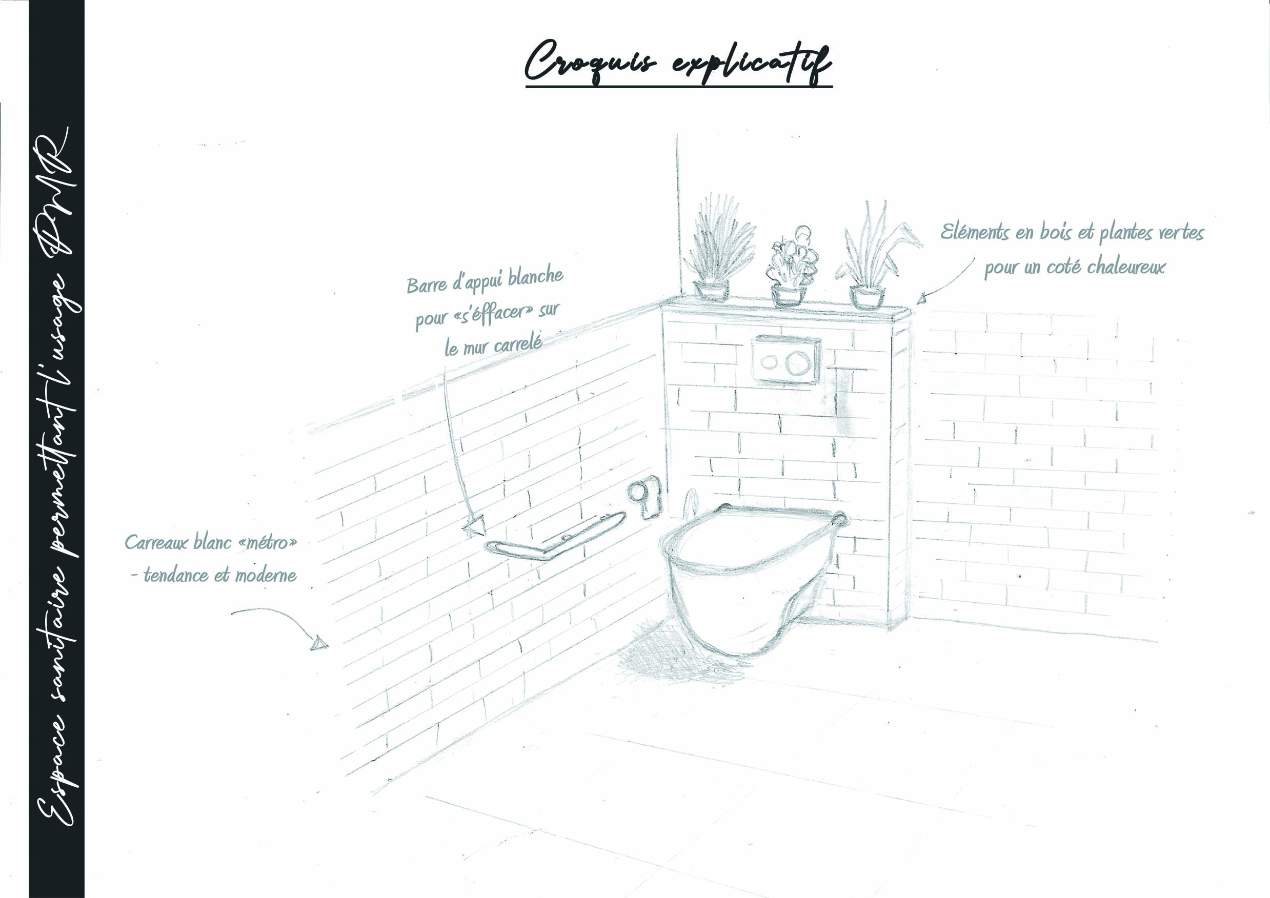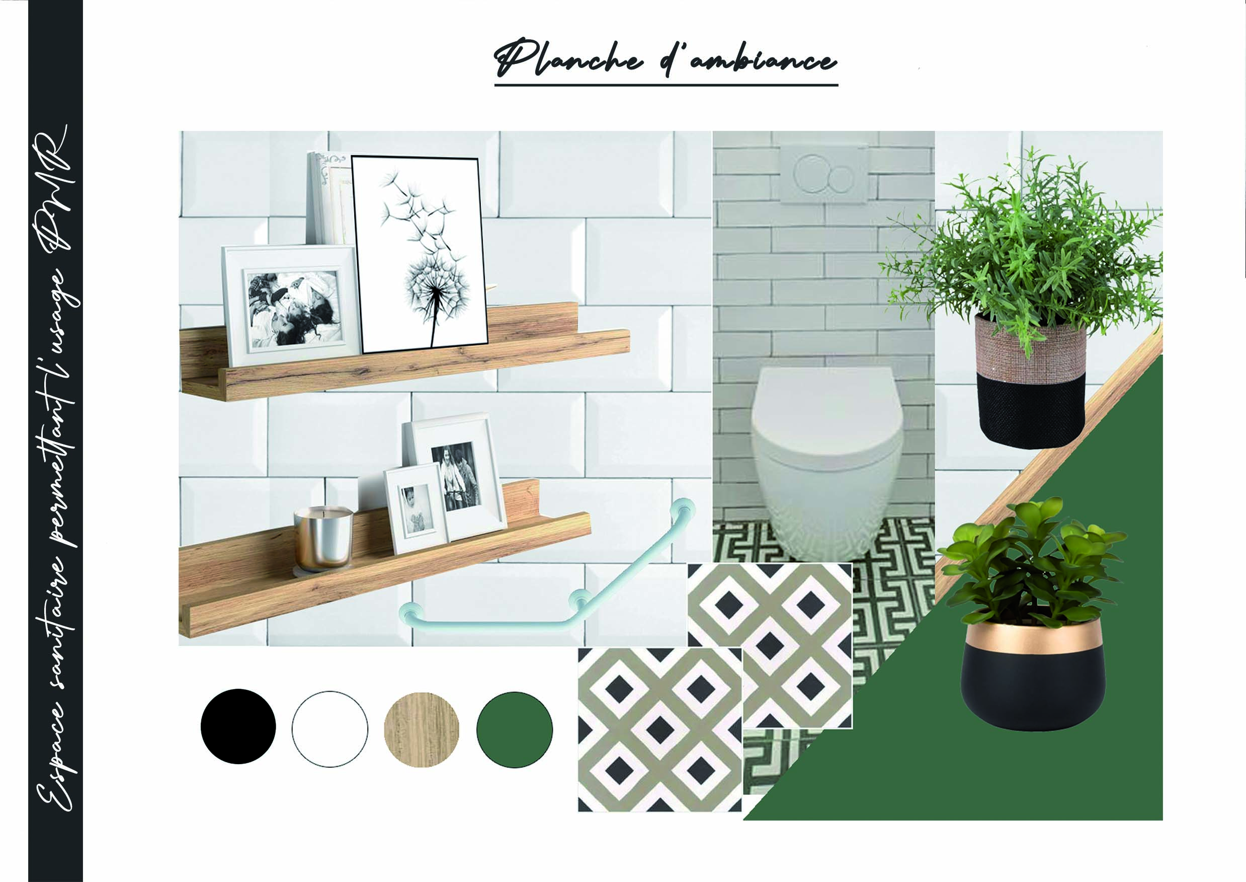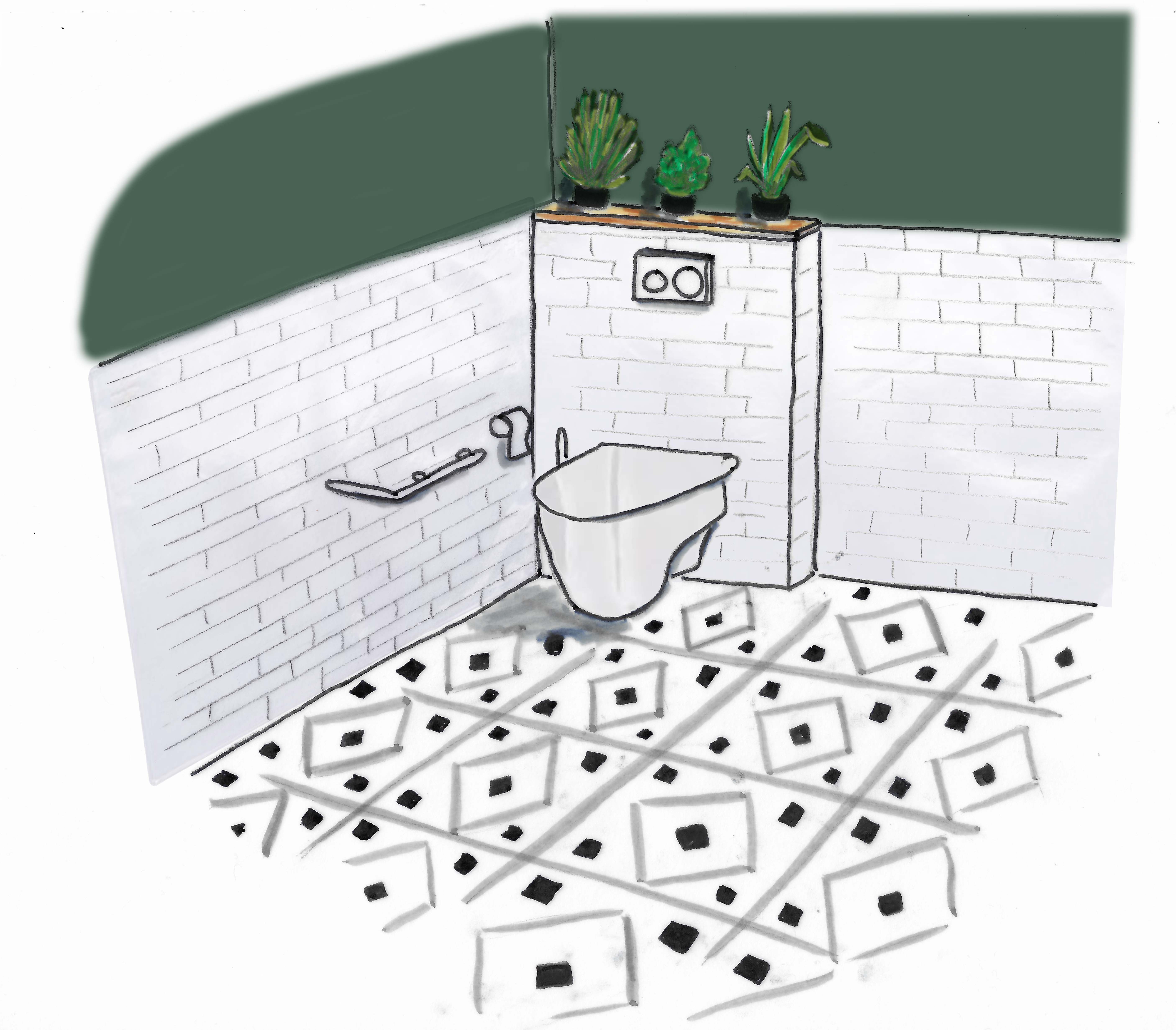 Des toilettes avec accès PMR c’est avant tout des normes et mesures à respectées pour une utilisation la plus ergonomique possible, mais il ne faut néanmoins pas négliger la décoration qui se veut ici moderne avec sa teinte de vert profond et ses carreaux de ciment au sol. La touche chic est apportée par le brillant du carrelage « métro ». Septembre 2021