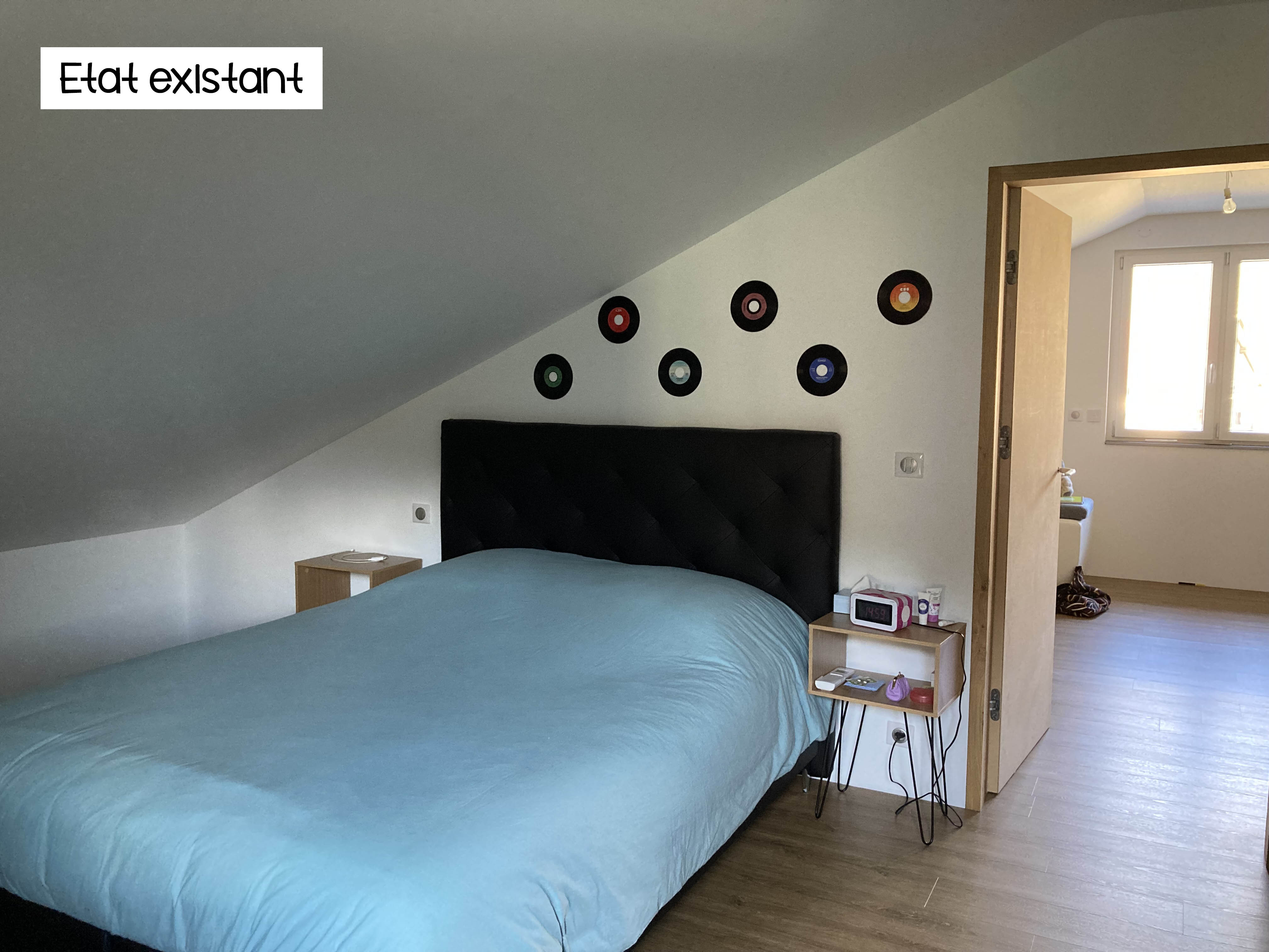 Une fois l’espace dégagé, j’ai envisagé la redistribution des surfaces en fonction notamment des contraintes techniques, tout particulièrement ici où mes clients souhaitaient intégrer une pièce d’eau dans leur chambre et où la mansarde occupe une partie importante de l’espace.