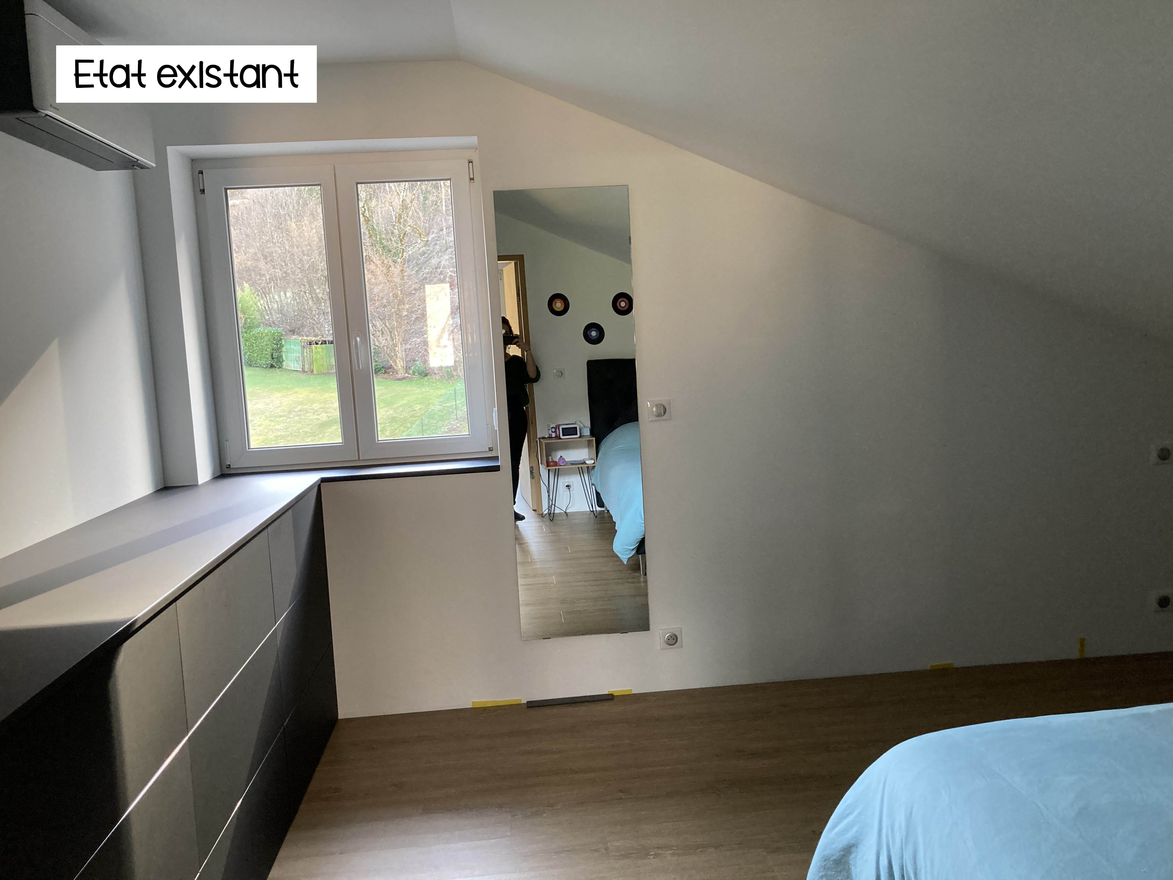 La création de nouveaux espaces dans cette grande chambre dont l’espace était mal exploité à nécessité une planification minutieuse. La première étape a été de déblayer virtuellement l’espace en enlevant les meubles et objets superflus, permettant ainsi une meilleure visualisation des potentialités. Trois espaces devaient être intégrés à la chambre ; un espace nuit, un dressing et une partie salle d’eau avec douche.