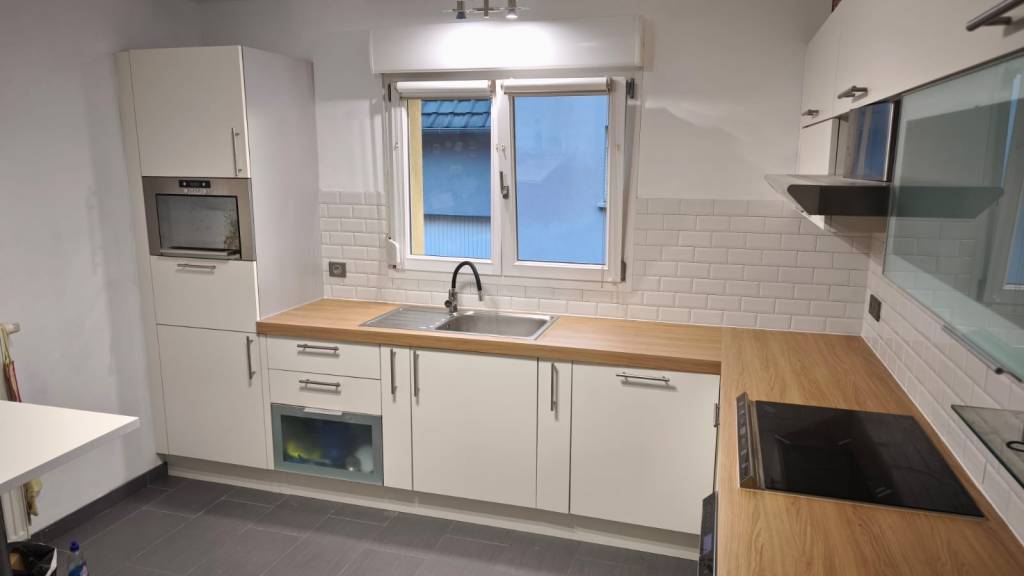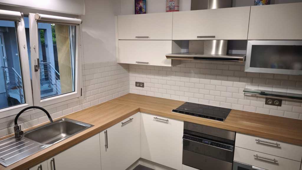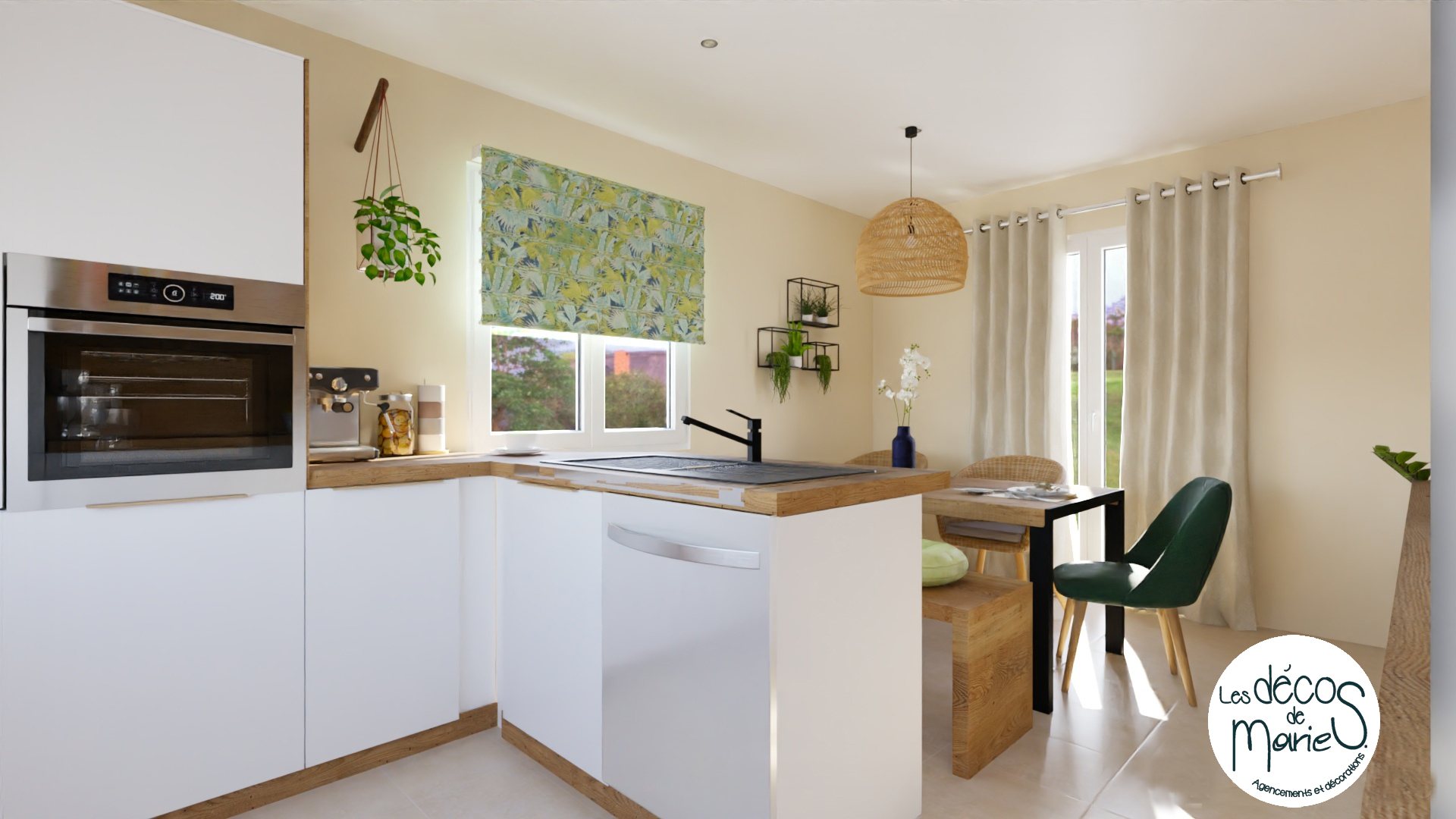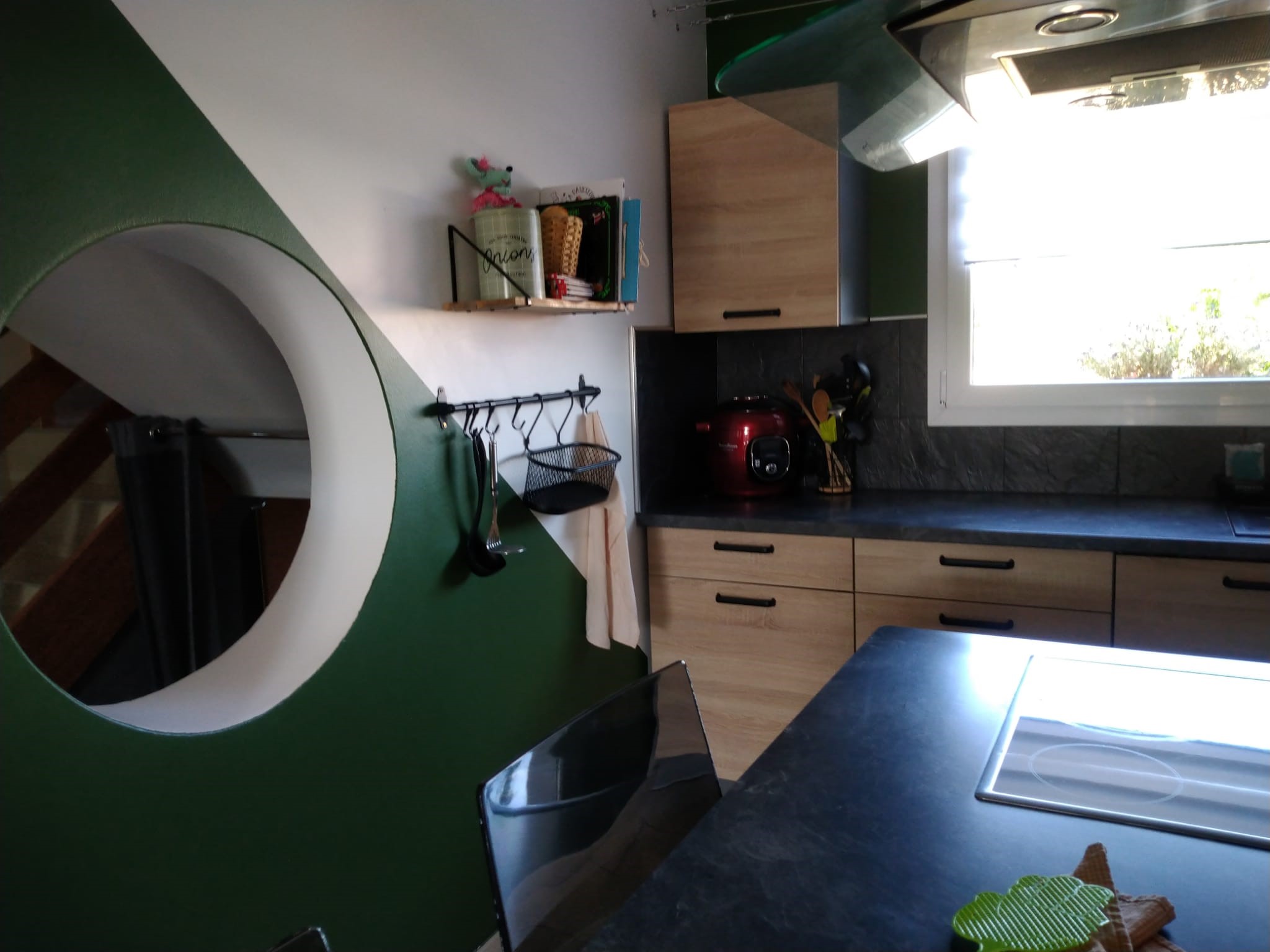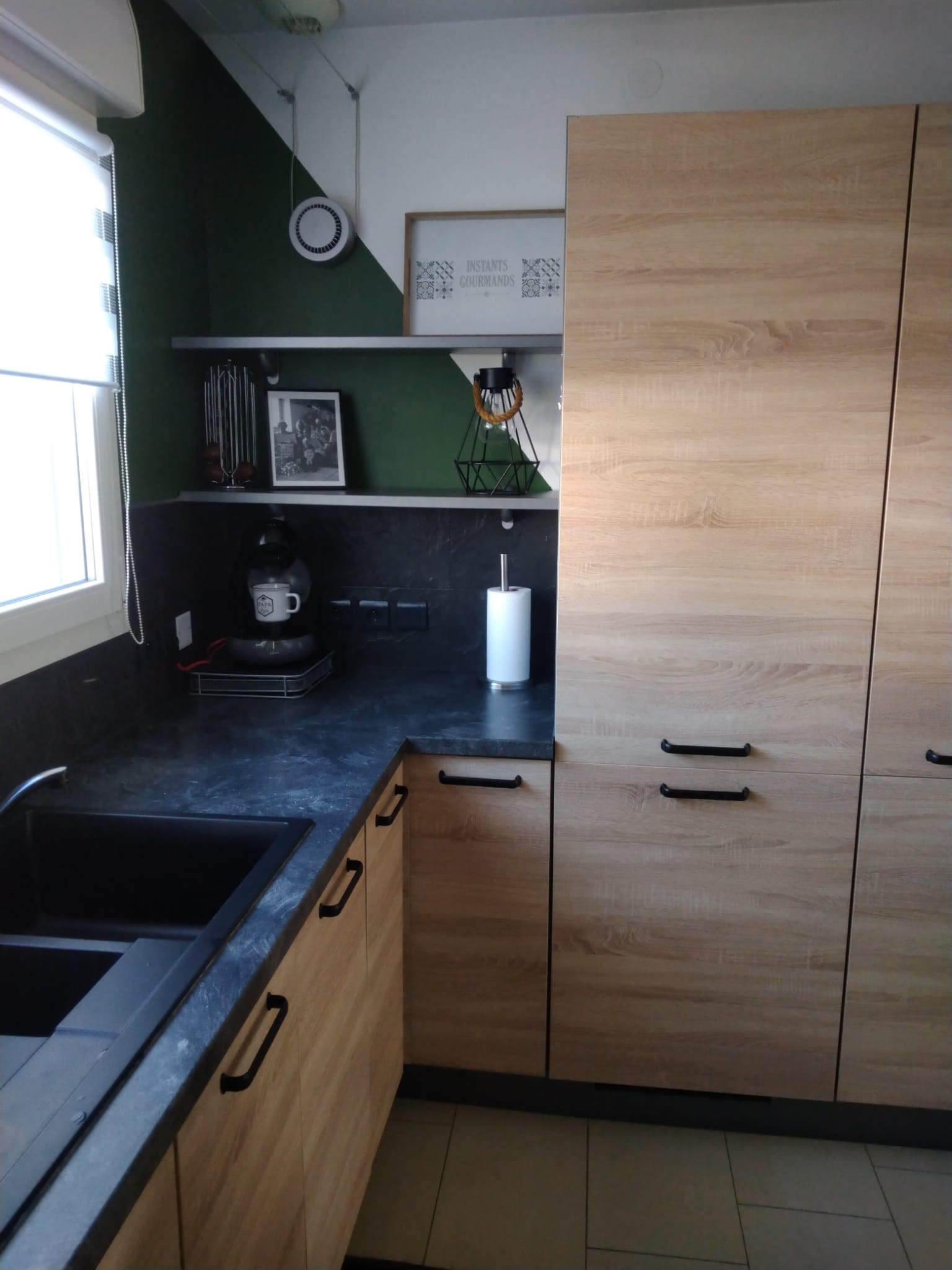 Après plusieurs années passées dans leur cuisine rouge laquée, le couple souhaitait une ambiance radicalement opposée mais sans engager de gros travaux. Le changement des façades laquées rouge pour des façades bois clair à tout de suite apporté le coté chaleureux et doux attendu, le plan de travail a été conservé pour limiter les dépenses. L’apport d’objet déco en matières naturelles ainsi que la couleur verte des murs renforce l’ambiance nature et paisible. Août 2022