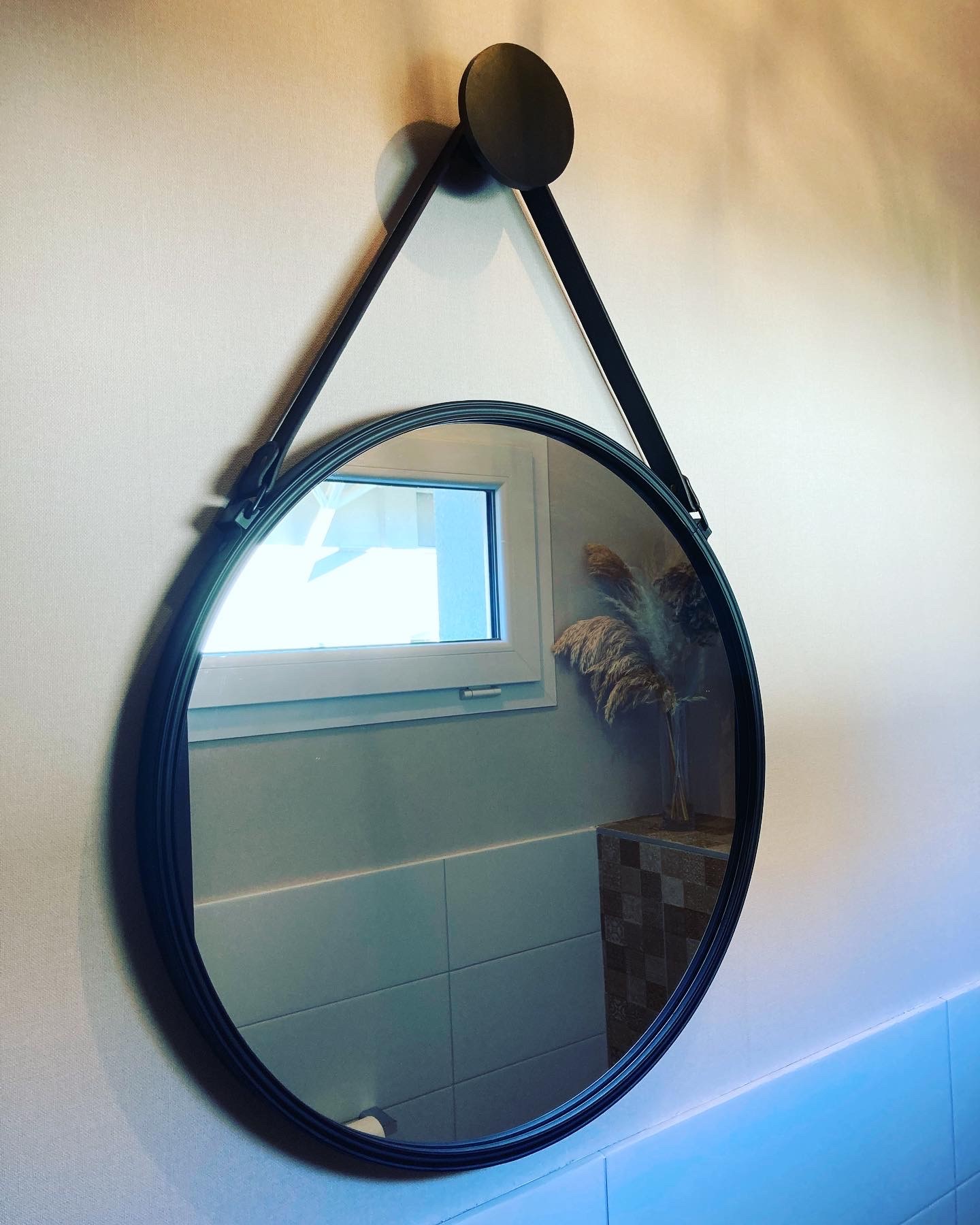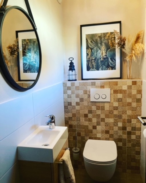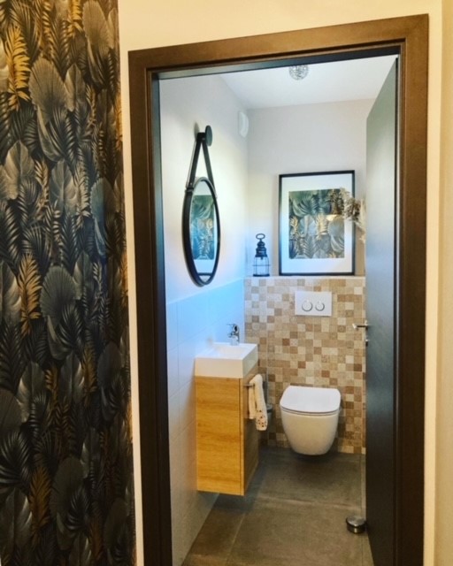 En décoration toutes les pièces ont leur importance et les toilettes ne sont bien évidemment pas en reste 🙂 ! Les teintes naturelles et douces de ce petit coin nous donne l’envie d’y rester … Le cadre noir et le miroir suspendu viennent apporter une touche de caractère à la décoration bohème. La touche « chic » est apportée par la tapisserie de l’entrée que l’on retrouve en rappel dans le cadre au dessus des toilettes suspendues. Août 2022