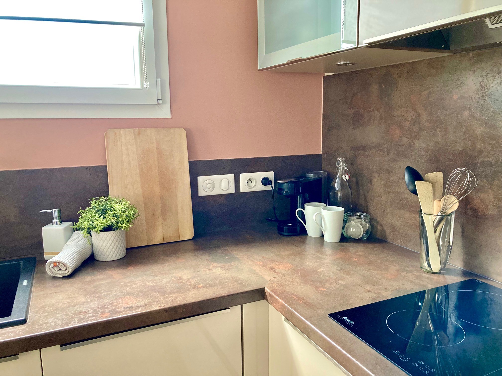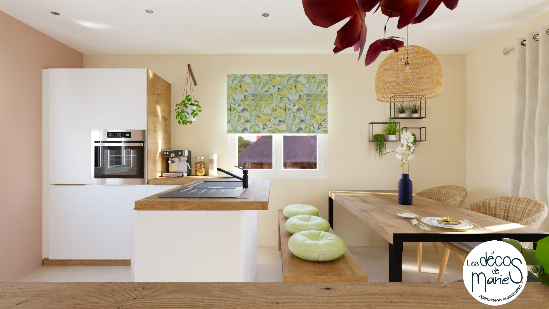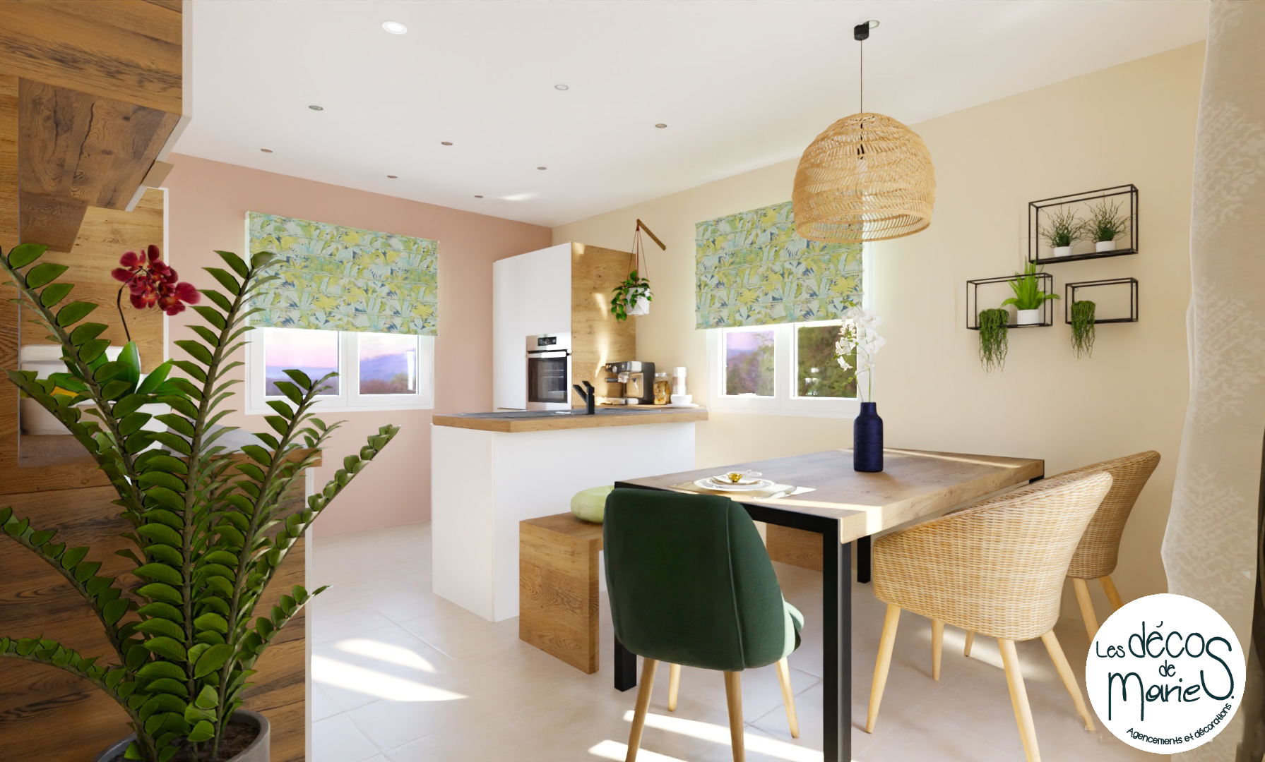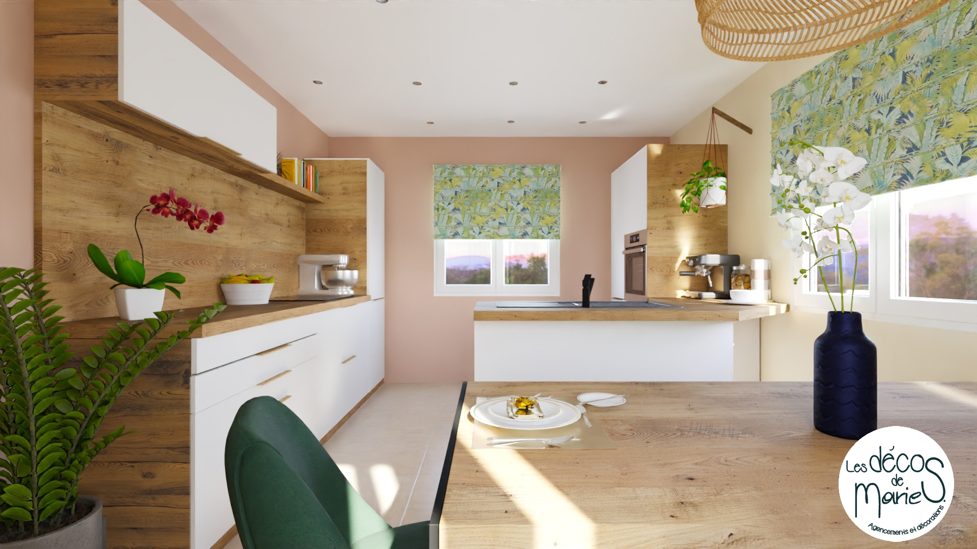Voici la réalisation d’un relooking pour moins de 200€. Pour ce projet, le couple souhaitait égayer et éclaircir leur cuisine mais sans toucher aux façades, ni à la crédence. Le changement a été apporté d’un côté par la nouvelle couleur rose terracotta au mur pour adoucir l’atmosphère et également par l’apport d’accessoires en bois et de plantes pour une ambiance chaleureuse. L’organisation du plan de travail a été repensée pour une cuisine plus fonctionnelle, au mur, les étagères en bois permettent de poser les objets décos qui pourront facilement être changés au fil des saisons.