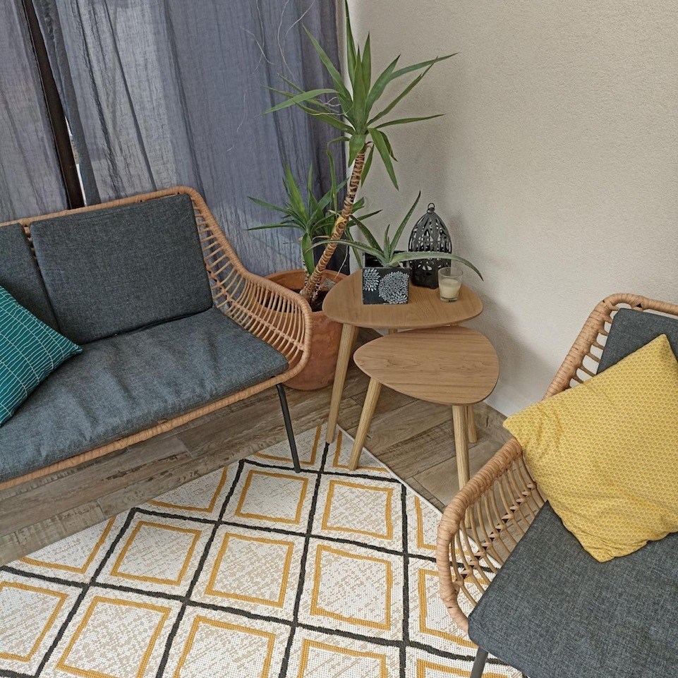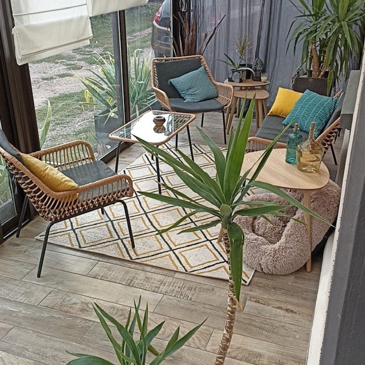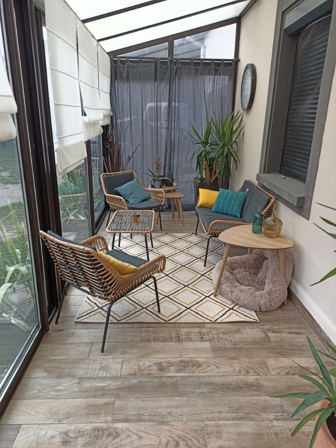 La véranda est la pièce lumineuse par excellence ! Quel plaisir de profiter des premiers rayons du soleil derrière ses larges baies vitrées. Pour ce projet, j’ai redonné un fonction précise à cette véranda qui n’était pas vraiment exploitée du fait de sa très faible largeur. La famille possède maintenant un petit coin chaleureux pour prendre le café ou partager un apéritif avec des amis. Le choix du sol en carrelage effet parquet apporte un coté chic et un esprit » dedans/ dehors », renforcé par le mobilier de jardin combiné au tapis.