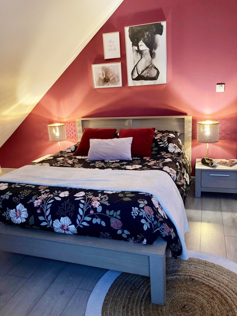 Pas de grands changements pour cette pièce, de nouveaux d’accessoires décos et un changement de linge de lit ont suffit pour permettre un changement d’ambiance et basculer cette chambre dans un esprit bucolique.