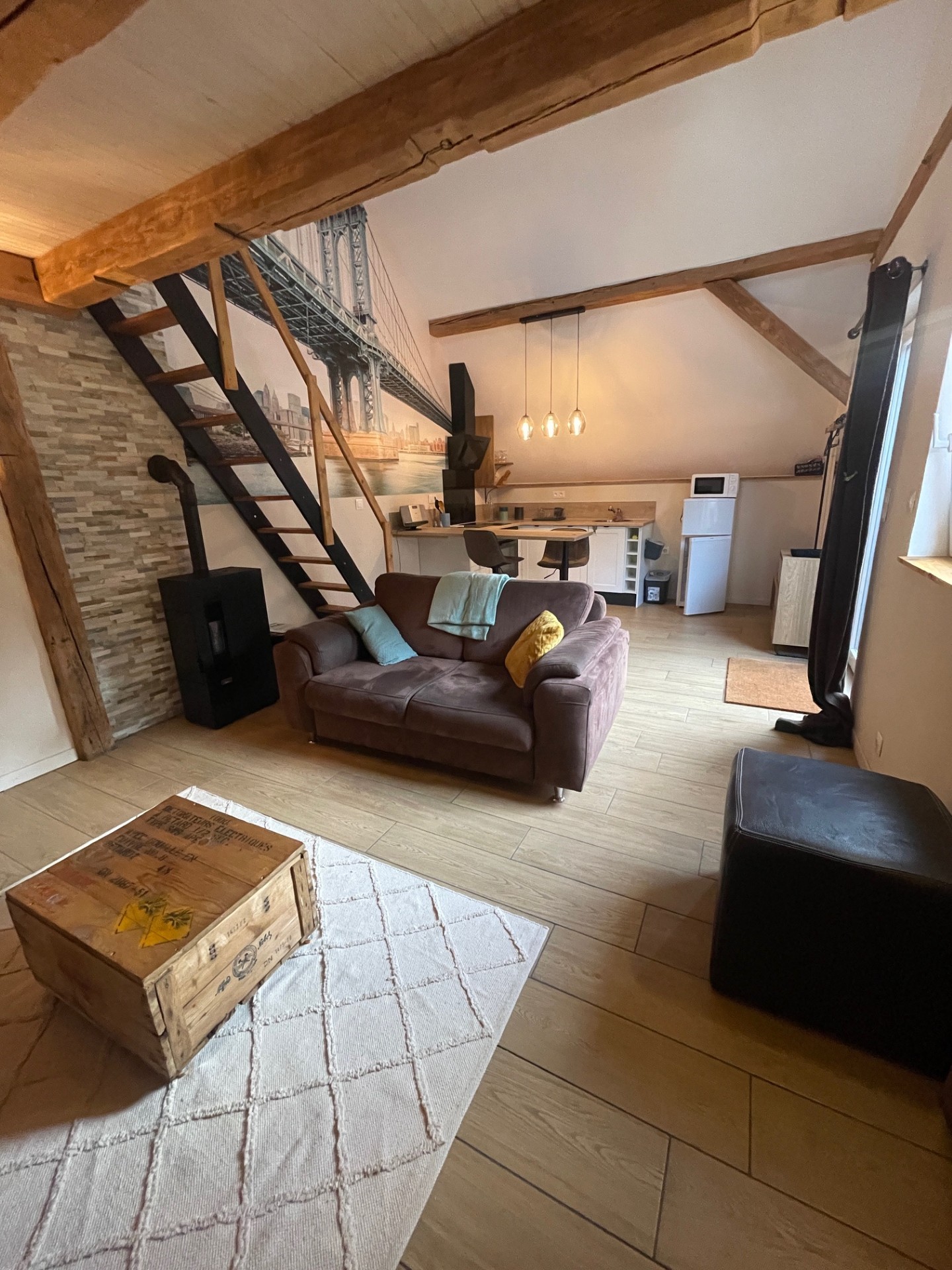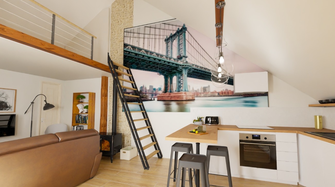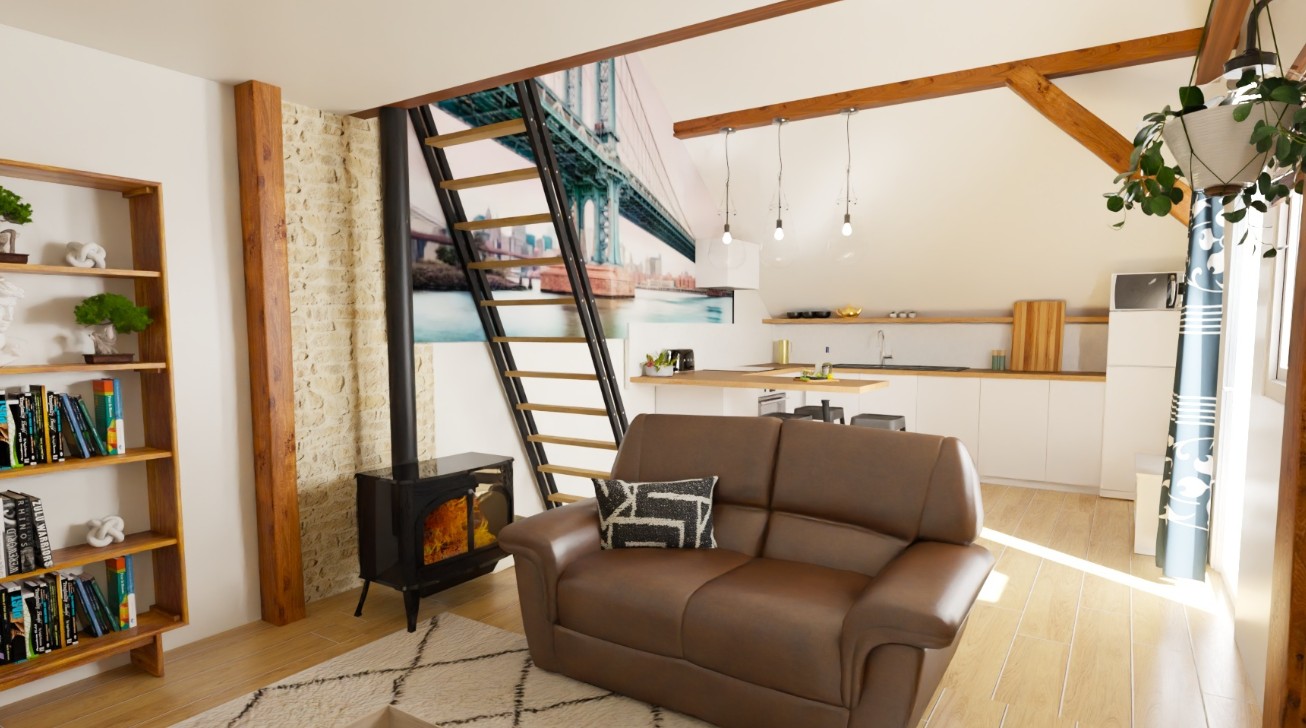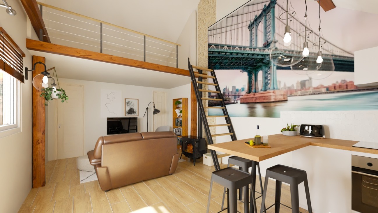 Ce projet m’a permis de transformer un petit logement avec poutres apparentes et mezzanine en un Airbnb chaleureux et plein de charme. À l’origine, l’espace ne possédait pas de véritable identité. J’ai donc imaginé une ambiance industrielle légère, mêlant matériaux bruts et touches contemporaines, pour lui donner du caractère tout en conservant la luminosité et la convivialité du lieu. Les poutres en bois ont été mises en valeur comme fil conducteur du décor. J’ai choisi des tons neutres et naturels, associés à quelques accents métalliques et à un mobilier fonctionnel, afin d’optimiser chaque mètre carré sans alourdir l’ensemble. La mezzanine, pensée comme un cocon, offre désormais un coin nuit confortable, tandis que le niveau principal accueille un espace de vie pratique et harmonieux, idéal pour les séjours de courte durée.