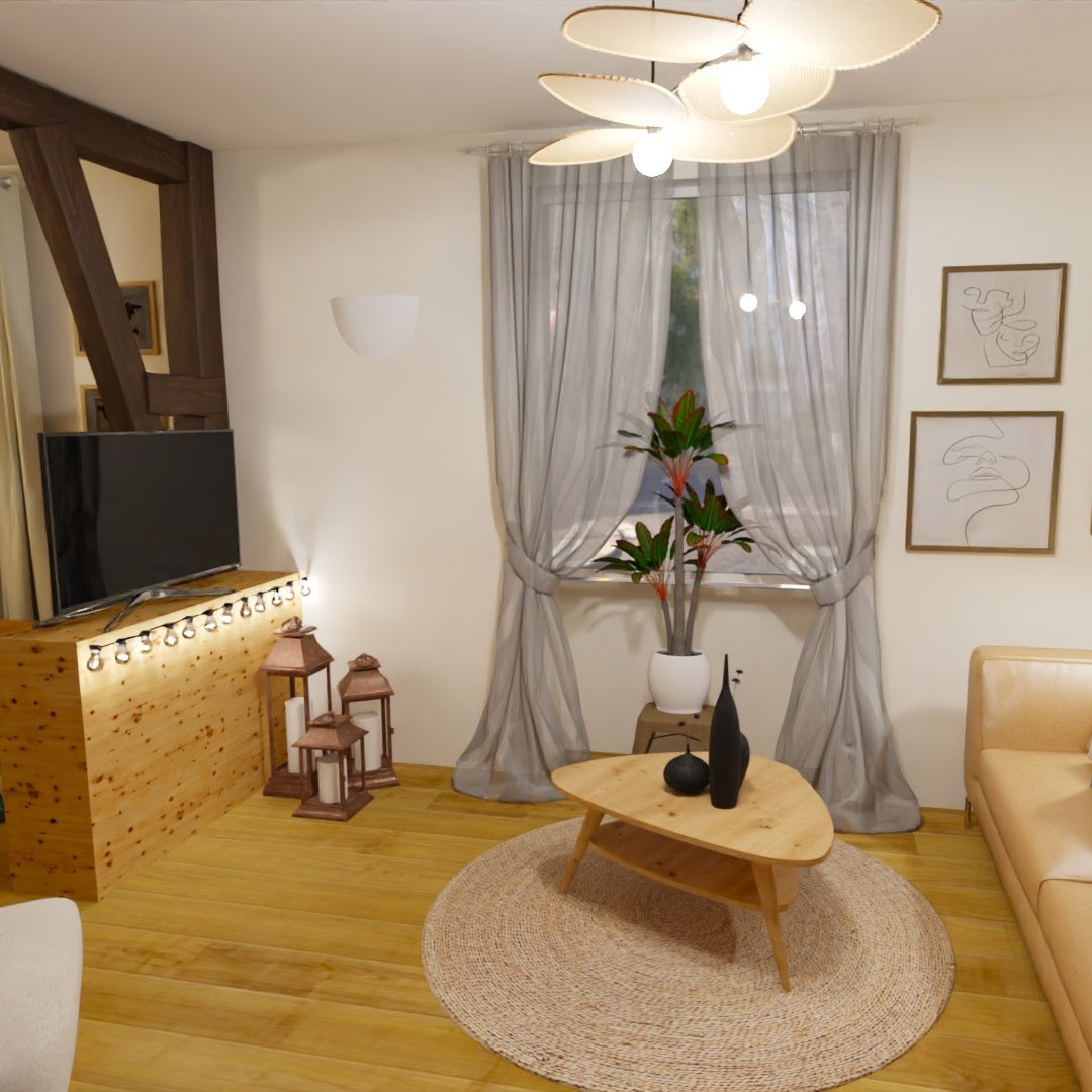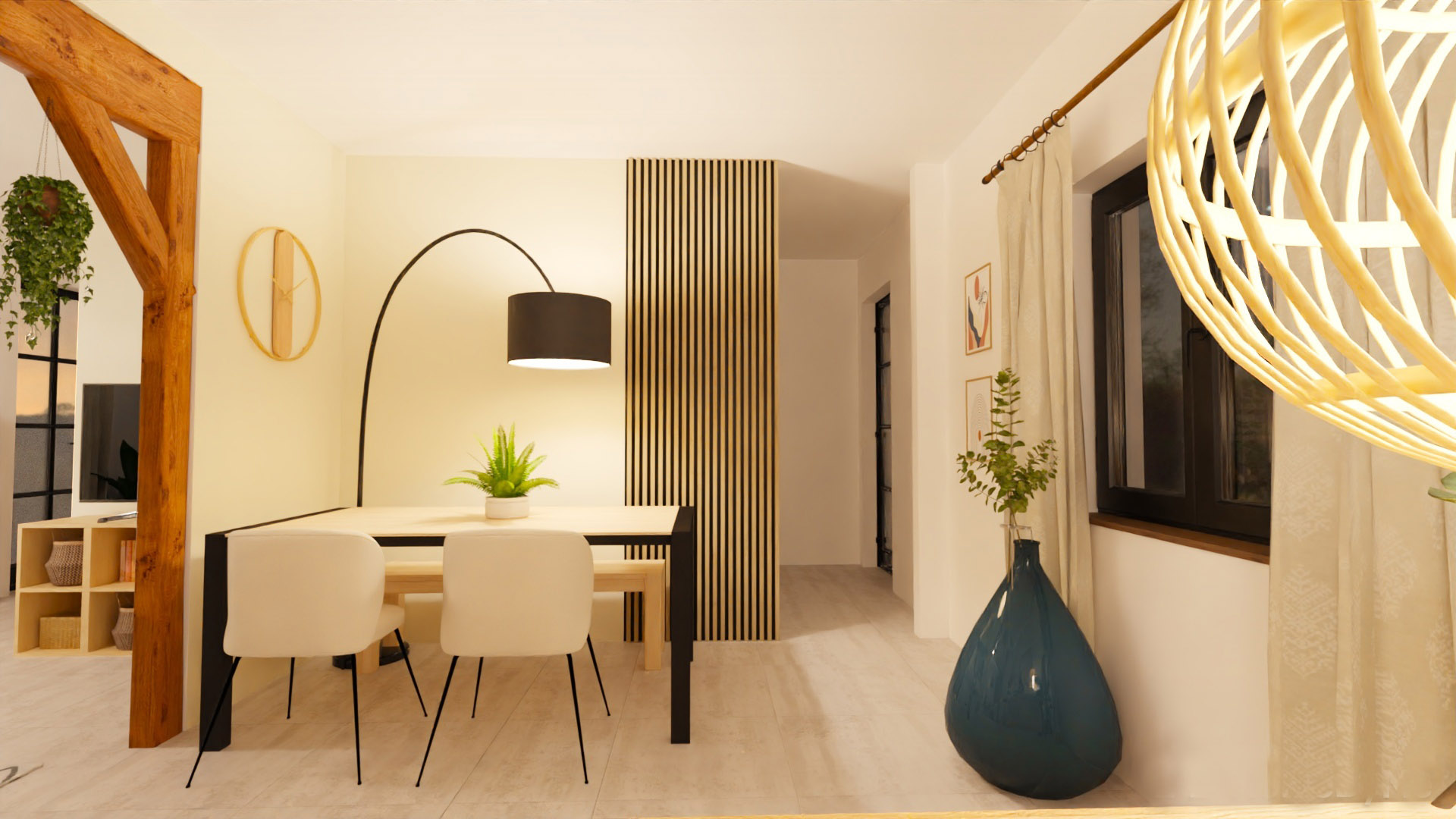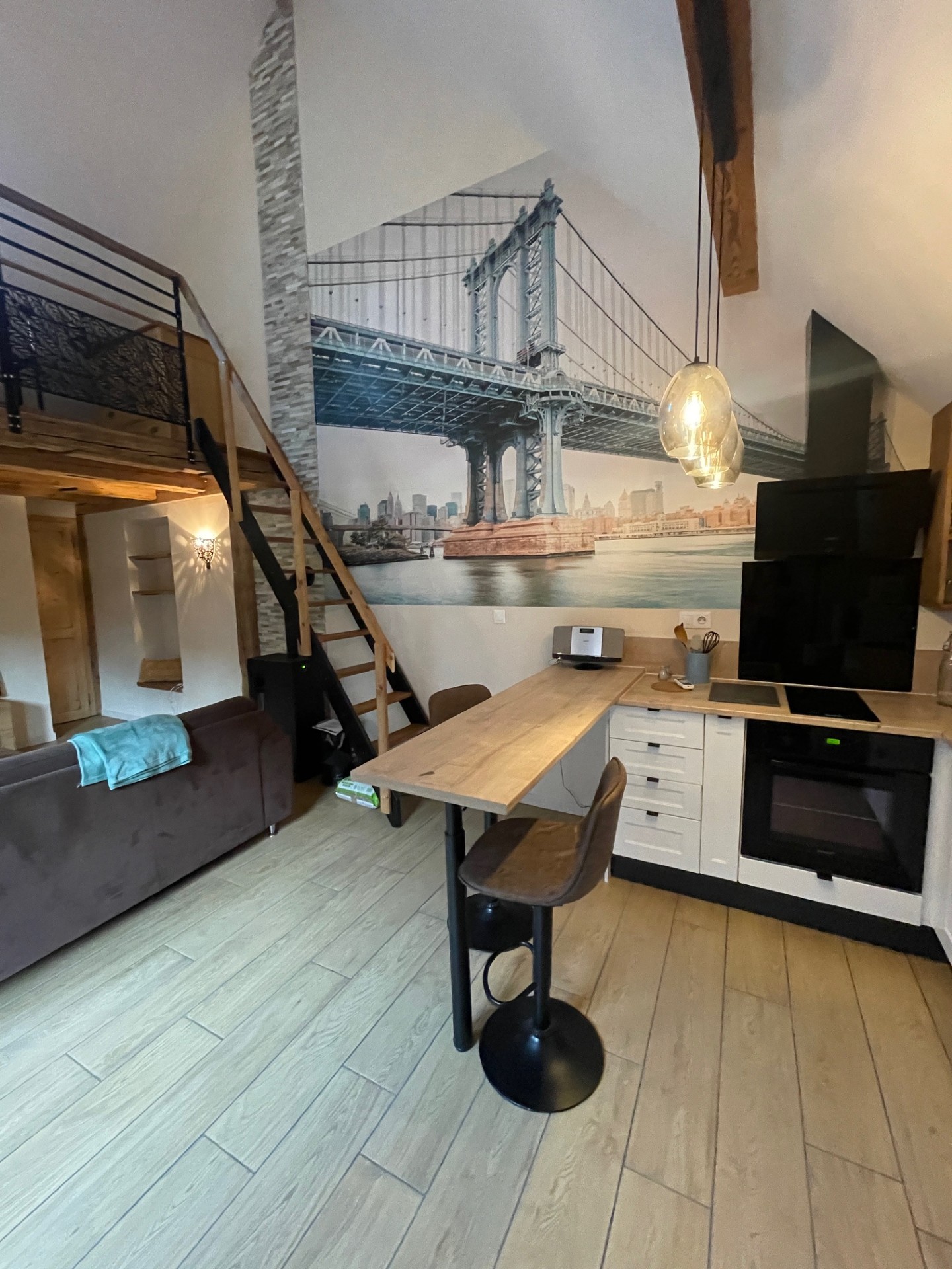 Ce projet m’a permis de transformer un petit logement avec poutres apparentes et mezzanine en un Airbnb chaleureux et plein de charme. À l’origine, l’espace ne possédait pas de véritable identité. J’ai donc imaginé une ambiance industrielle légère, mêlant matériaux bruts et touches contemporaines, pour lui donner du caractère tout en conservant la luminosité et la convivialité du lieu. Les poutres en bois ont été mises en valeur comme fil conducteur du décor. J’ai choisi des tons neutres et naturels, associés à quelques accents métalliques et à un mobilier fonctionnel, afin d’optimiser chaque mètre carré sans alourdir l’ensemble. La mezzanine, pensée comme un cocon, offre désormais un coin nuit confortable, tandis que le niveau principal accueille un espace de vie pratique et harmonieux, idéal pour les séjours de courte durée.