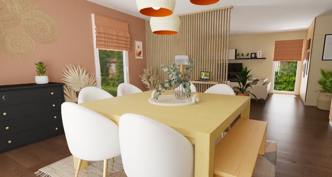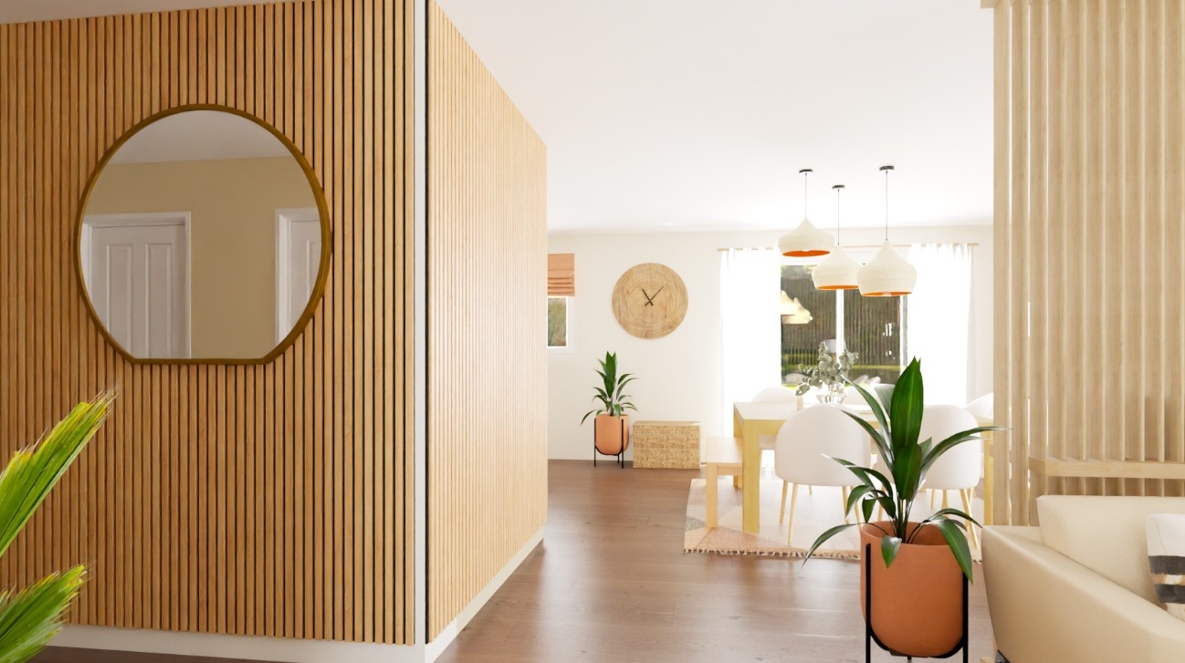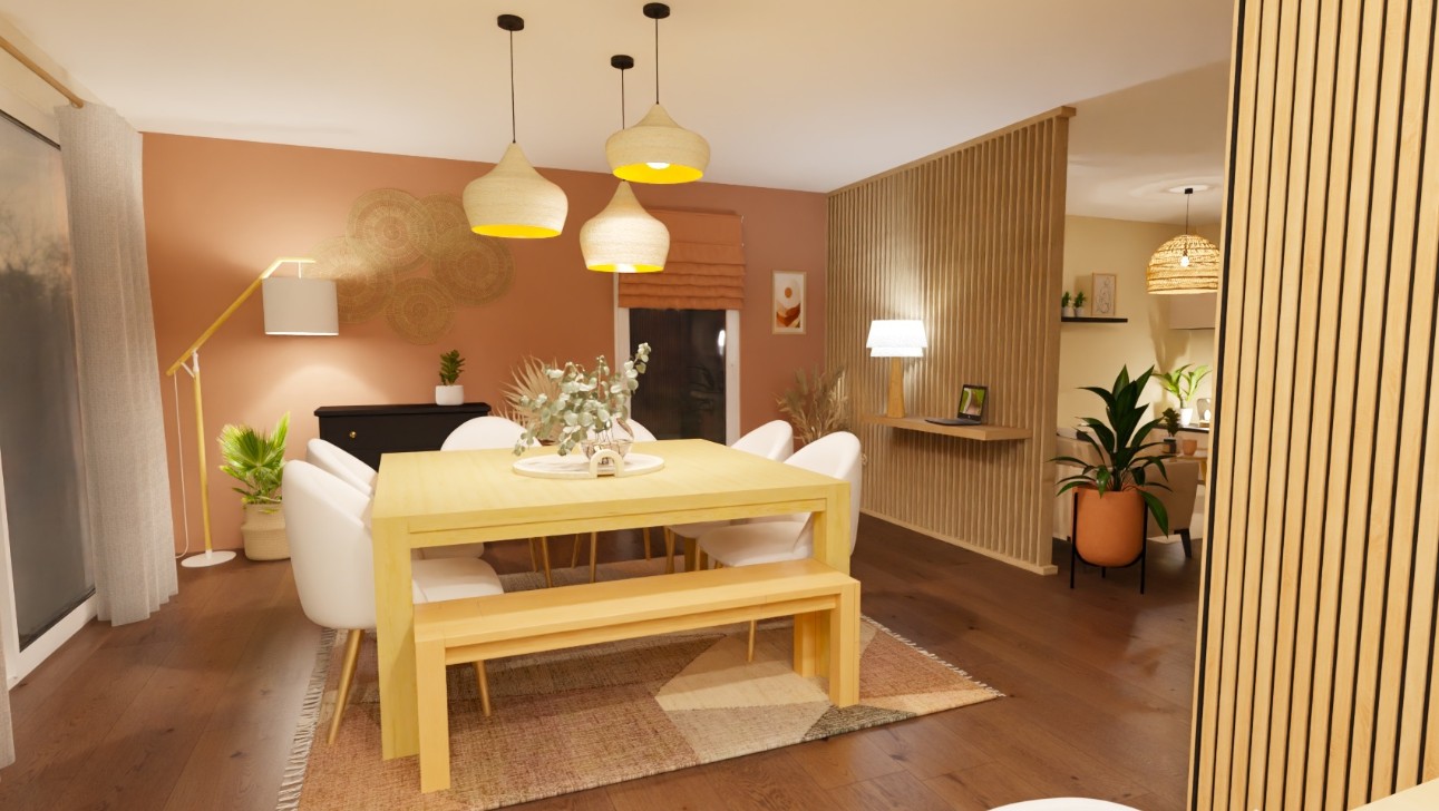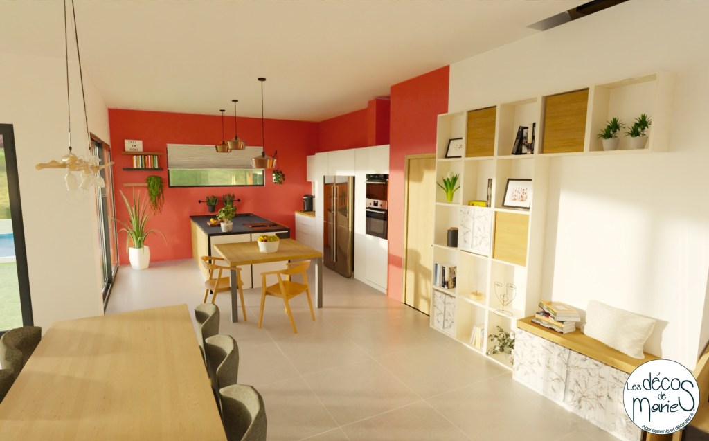 Cette pièce de vie, trop vaste et sans réelle identité, manquait cruellement de chaleur et de structure. Il a donc fallu redessiner chaque espace, pour cela j’ai placé un claustra en bois pour délimiter le salon de l’espace repas. Le petit coin bureau demandé par les propriétaires vient prendre place sur la séparation en bois. Matériaux que j’ai réutilisé pour « cacher » le placard derrière des tasseaux de bois. Afin de redonner de la chaleur à la pièce j’ai également joué sur les couleurs, le blanc et le gris sont remplacés par des couleurs chaudes comme le terracotta et le beige sable. Là aussi, chaque espace à sa propre couleur. Enfin, pour que l’espace cuisine soit également bien défini j’y ai fait installer un papier peint panoramique.