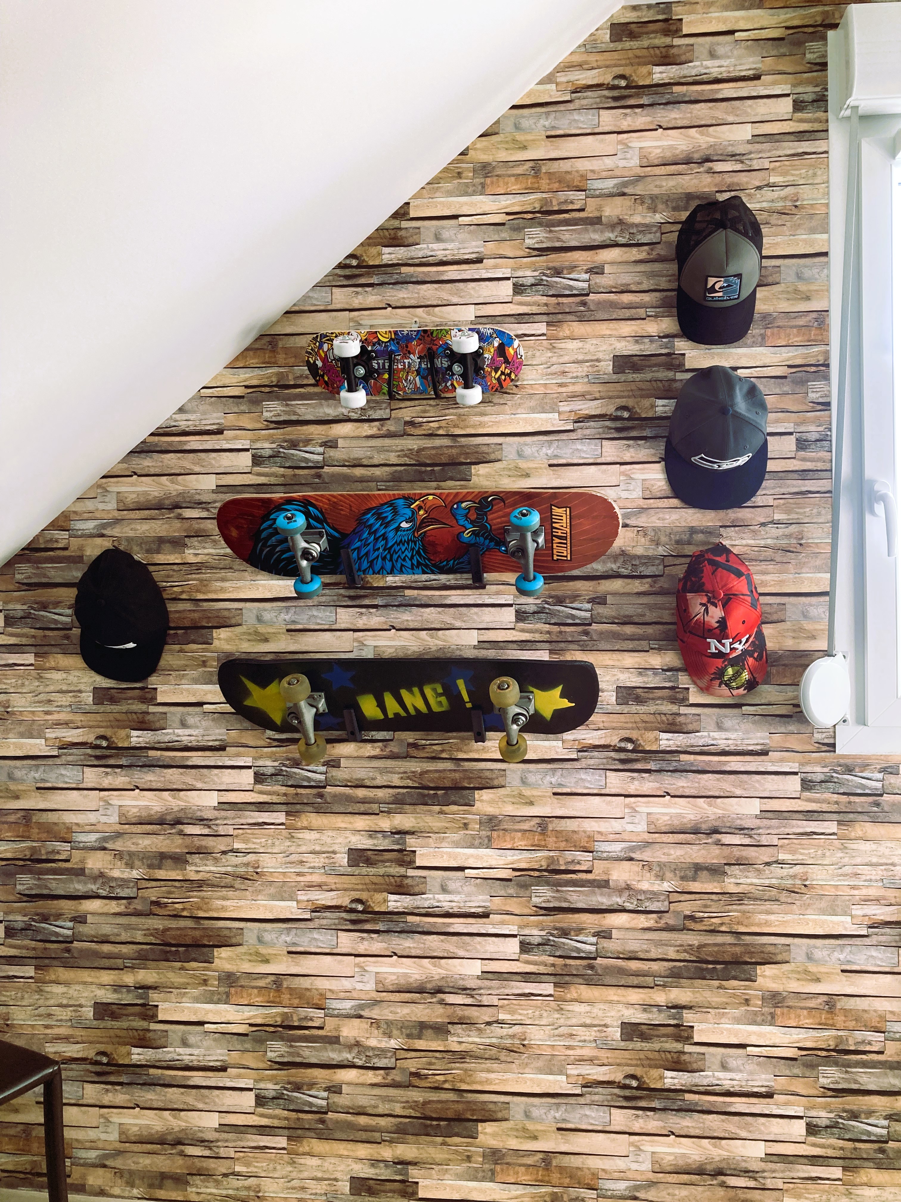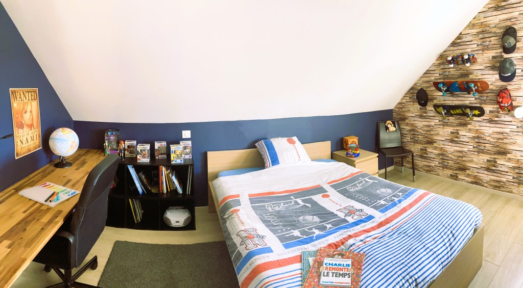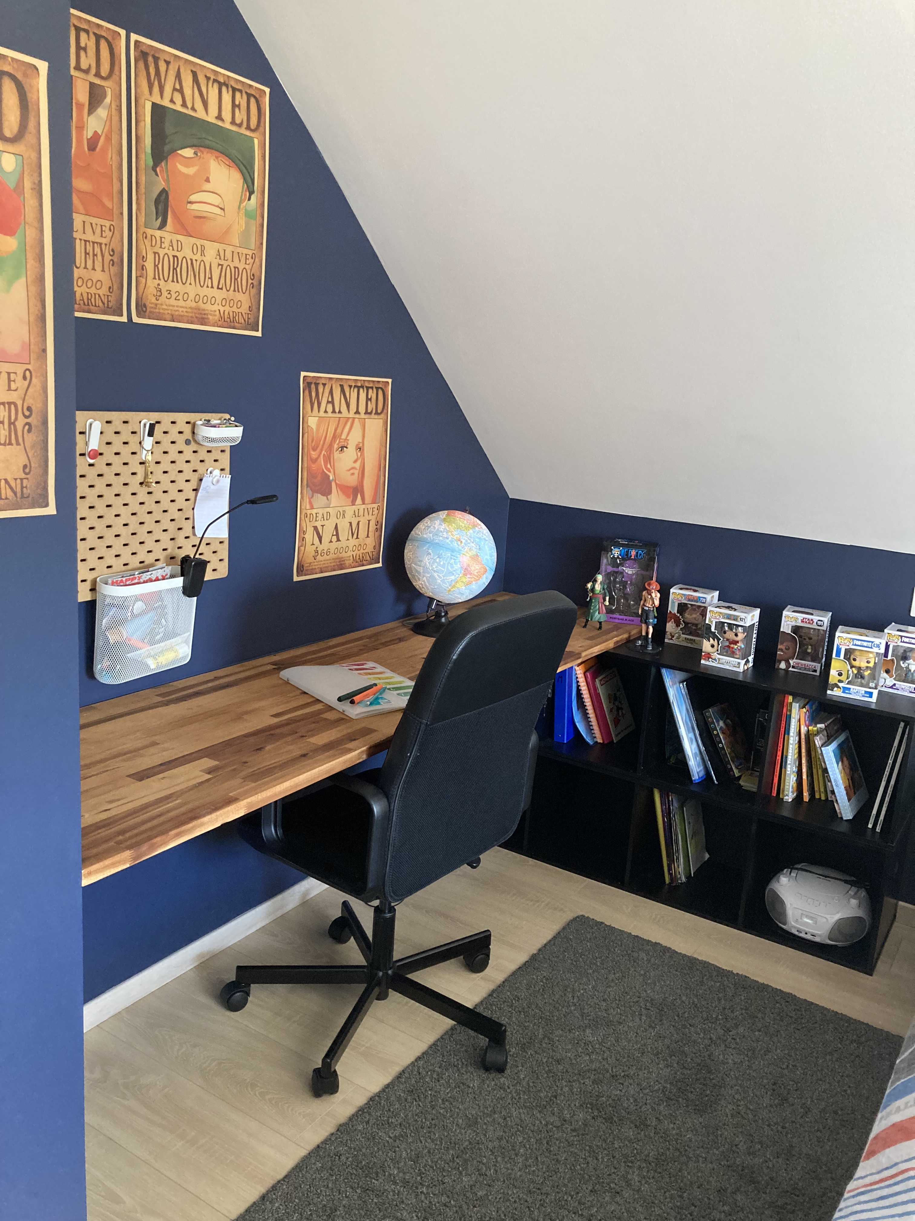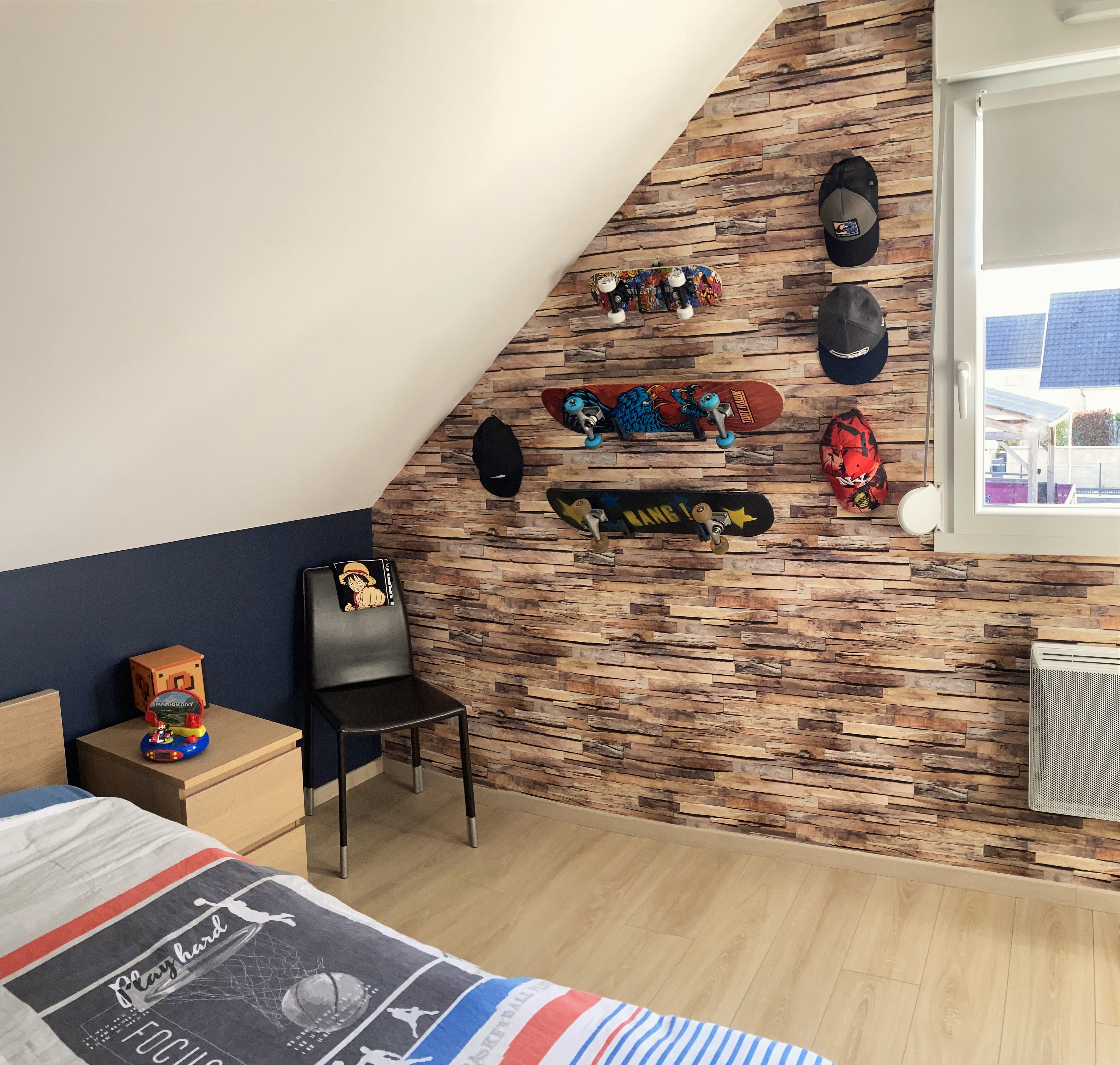 A 10 ans on dévore la vie à pleines dents et on découvre tous les jours de nouveaux centres d’intérêts, pas toujours facile d’en choisir un pour le thème de sa chambre …! Pas de problème ! Voici une chambre qui regroupe toutes les passions d’un jeune garçon, sans trop charger son espace personnel ; skate, manga, basket et musique tout y est :). Le secret c’est de consacrer un espace bien défini pour chaque ambiance, par exemple on retrouve ici l’espace manga autour du bureau et les skates sur le mur opposé, cela permet de garder une décoration harmonieuse.