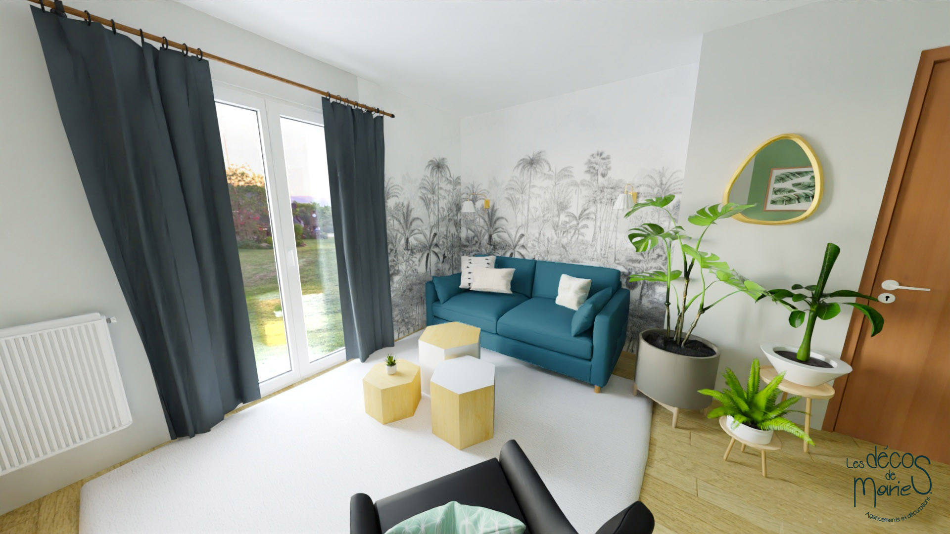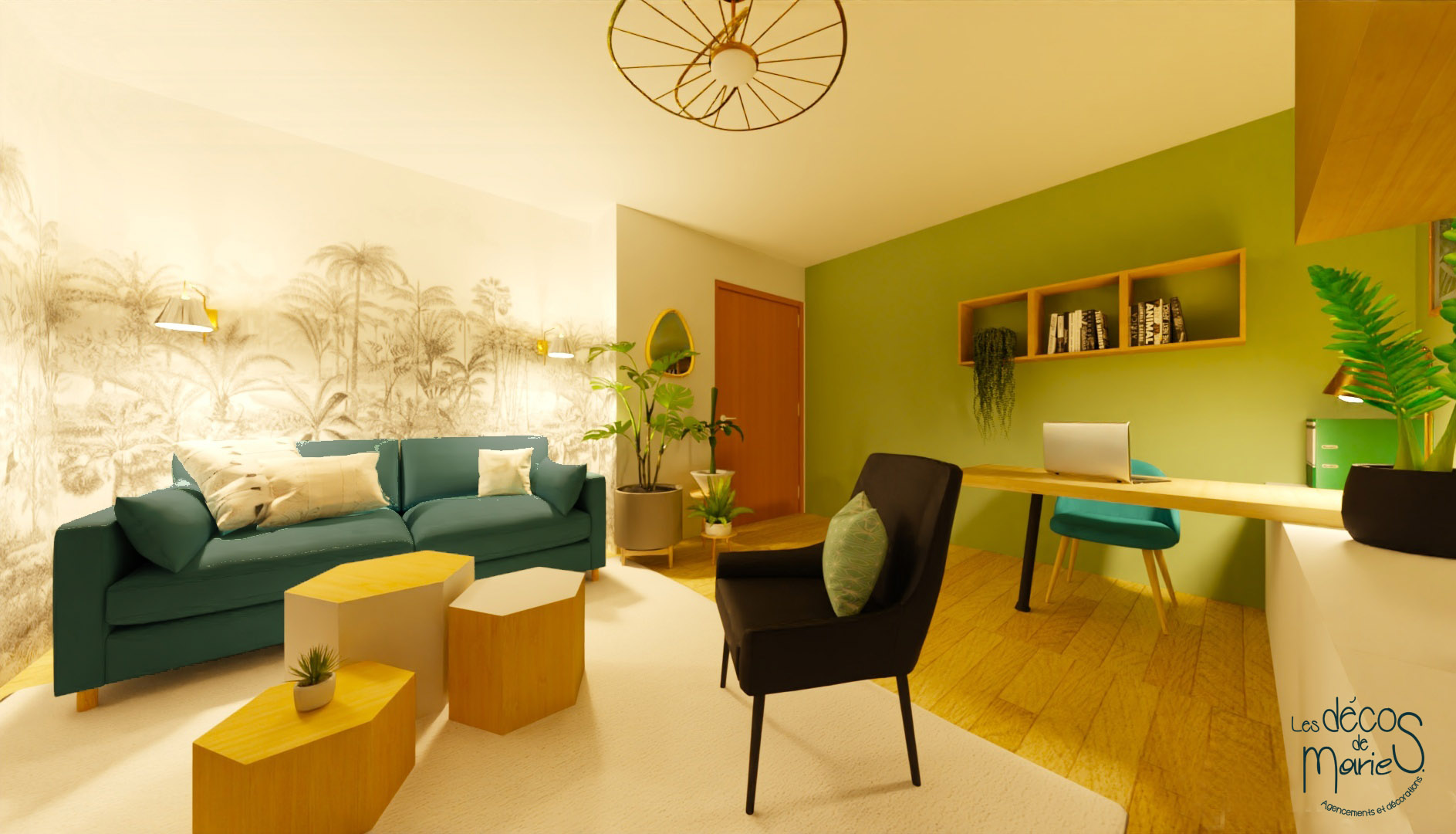 Donner sa place à un espace bureau/télétravail et à un salon dans un espace de 16m² n’est pas toujours aisé. Pour ce projet, la partie dédiée au télétravail est définie par la couleur au mur et par le bureau, placé face à la fenêtre afin de bénéficier de toute la clarté de la pièce, qui vient matérialiser la fin de l’espace. Le salon a été placé près de la fenêtre pour profiter de la vue vers le jardin, il est défini au sol par un tapis XXL qui vient également apporter un coté cosy à l’ambiance. Le canapé a été placé dans la petite niche tapissée de papier peint panoramique qui apporte un coté graphique à la décoration et permet une sensation d’espace.