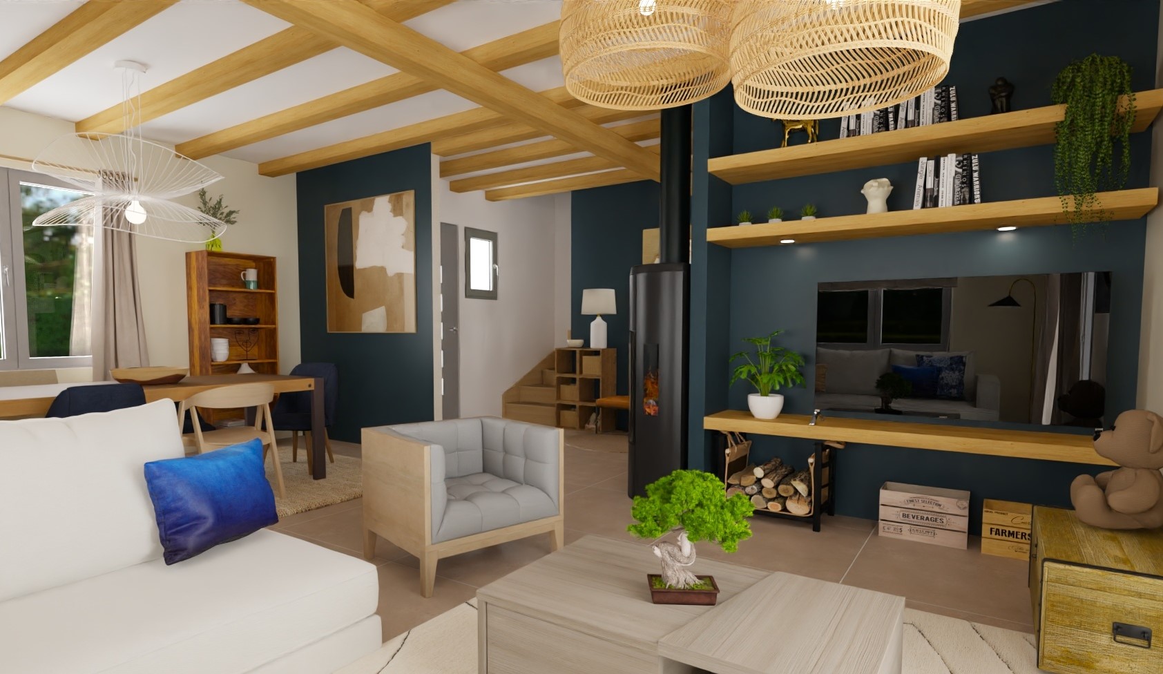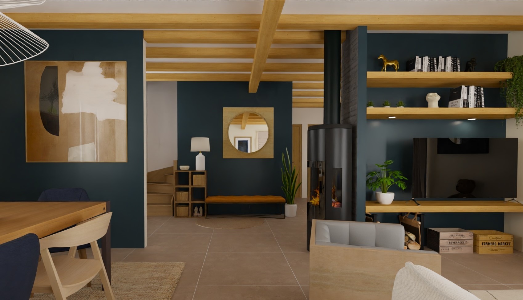 Lorsque mes clients ont acheté cette maison à ossature bois ils voulaient conserver son côté chaleureux, tout en la basculant dans un esprit déco plus moderne, j’ai donc conservé les poutres, qu’il à fallu sabler, mais j’ai abattu quelques murs afin d’ouvrir l’espace de vie et faciliter les circulations entre les pièces. Le coloris bleu profond se marie parfaitement avec le bois des poutres et des meubles et apporte un coté chic à la décoration. Un revêtement de sol unique a été utilisé pour unifier l’étage.