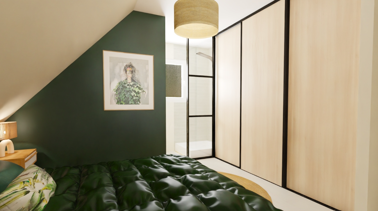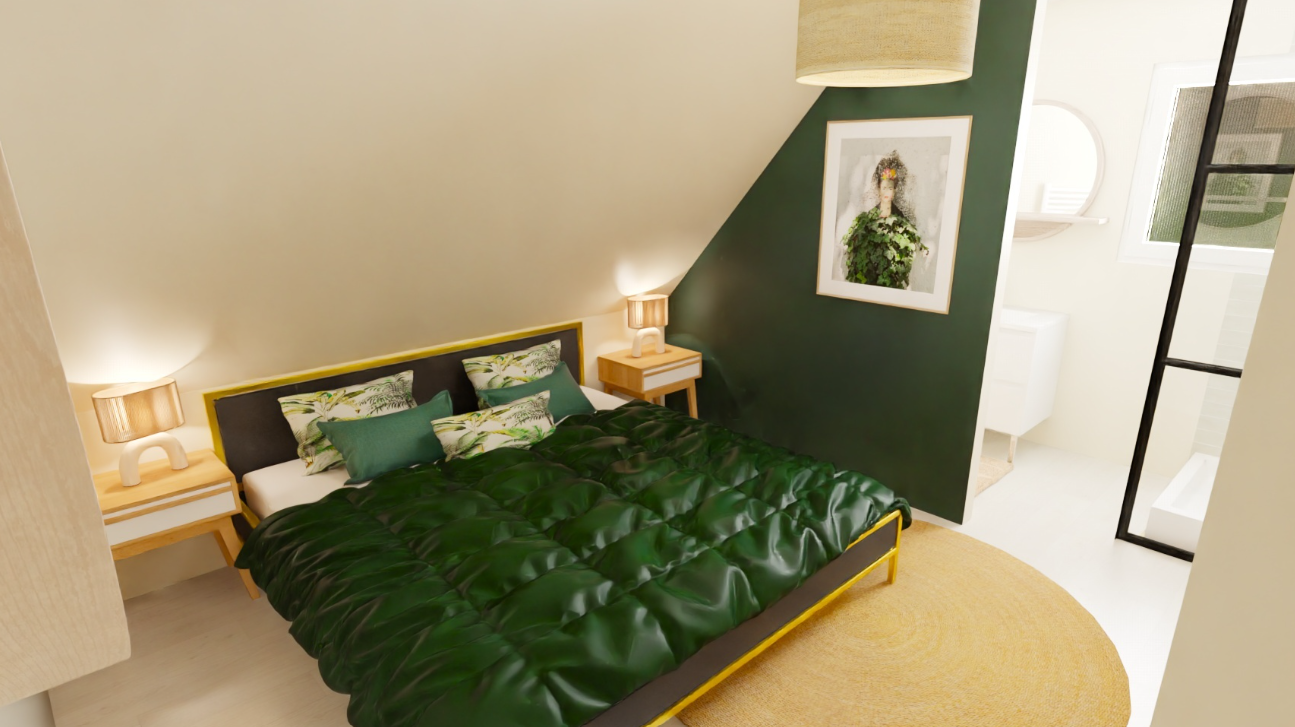 La redistribution faite, j’ai pu m’occuper de la partie décoration et couleurs, par exemple, pour la toute petite salle de bain j’ai choisi des couleurs claires et des matériaux réfléchissants qui contribuent à amplifier la luminosité et à créer une illusion d’espace alors que pour la partie nuit je suis restée dans des j’ai choisi un coloris vert, teinte profonde et apaisante.