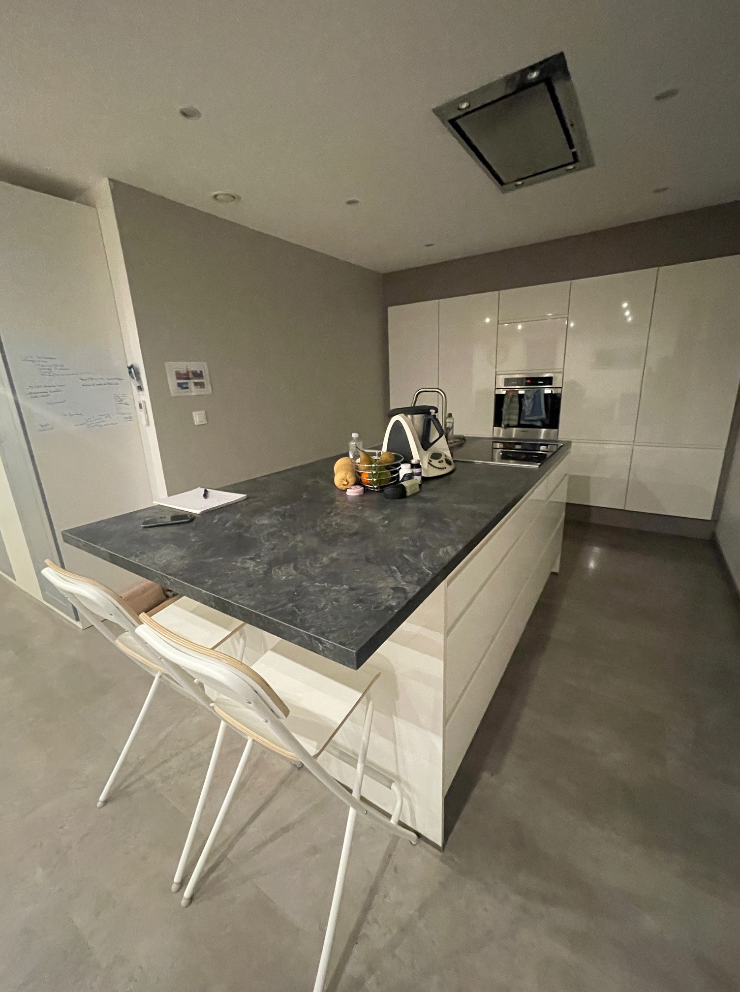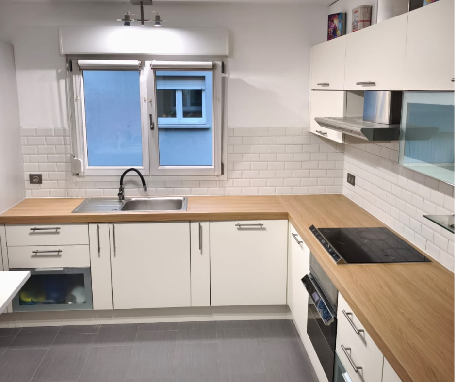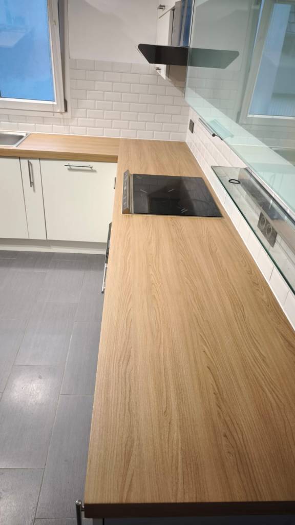 Pour ce projet, mon objectif était de moderniser une cuisine existante sans passer par une rénovation complète. Les façades et le plan de travail présentaient une structure solide, mais leur aspect visuel n’était plus au goût du jour. J’ai donc opté pour une solution astucieuse et économique : le revêtement adhésif Coverstyl’, une alternative idéale pour transformer une cuisine sans gros travaux. Les façades ont été recouvertes d’un film mate beige clair pour apporter chaleur et luminosité, tandis que le plan de travail a été habillé d’un film aspect bois, pour un rendu intemporel et élégant. Le résultat ? Une cuisine entièrement métamorphosée, plus actuelle et harmonieuse, sans démontage ni remplacement des meubles.